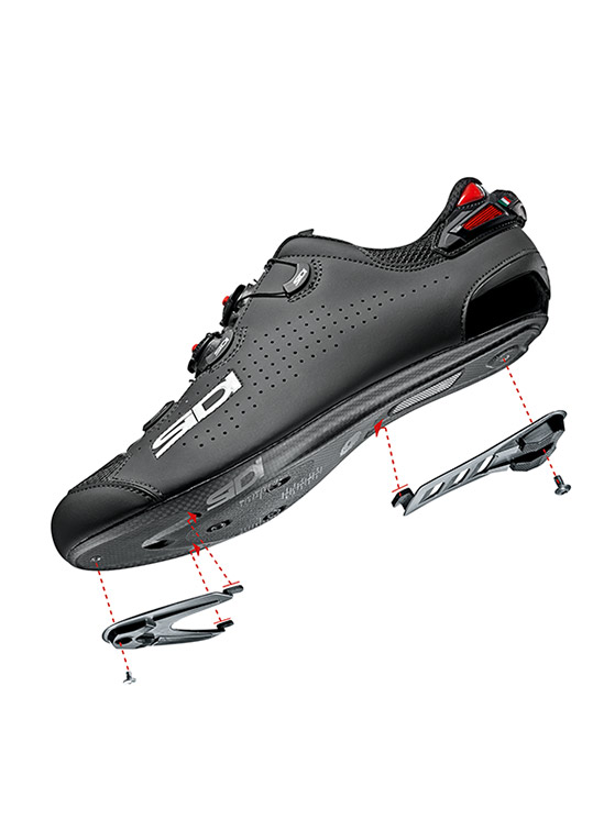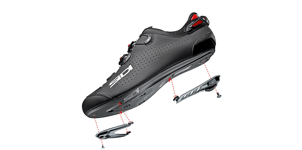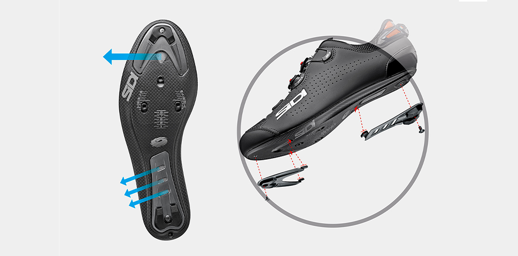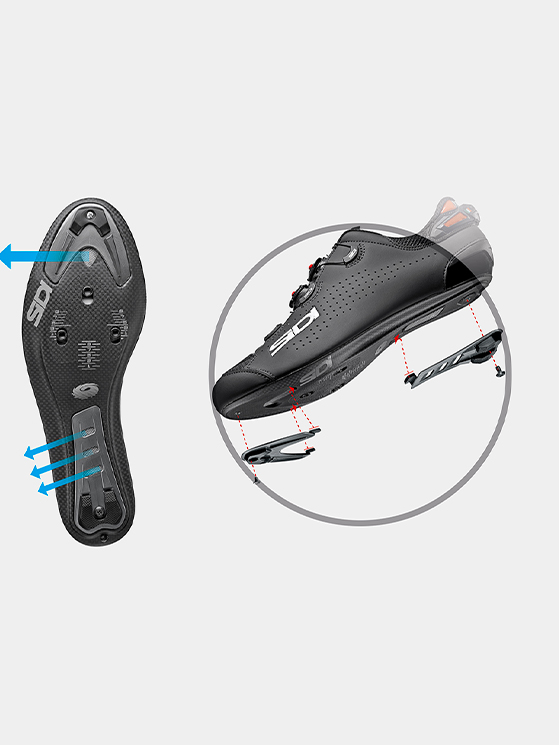 Per conoscere queste nuove scarpe partiamo dalla suola C-Boost SRS realizzata con un carbonio di ultimissima generazione. I tecnici Sidi hanno disegnato una zona metatarsale con una conformazione tale da favorire la trasmissione della potenza sui pedali. Un aspetto molto importante è che grazie ai nuovi fori ovali si hanno 5 millimetri in più di margine di regolazione delle tacchette per un posizionamento più preciso.