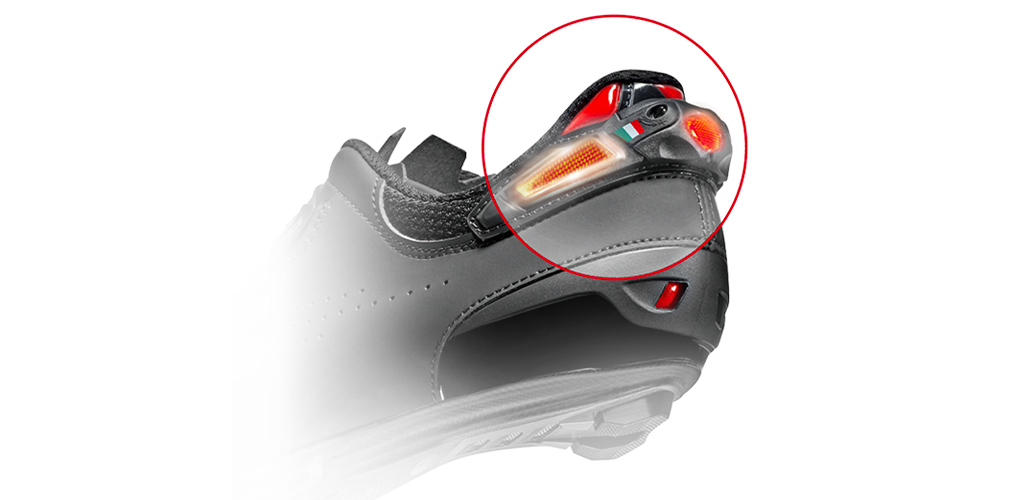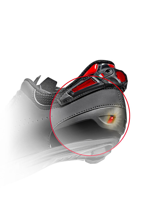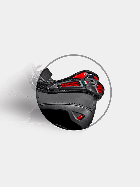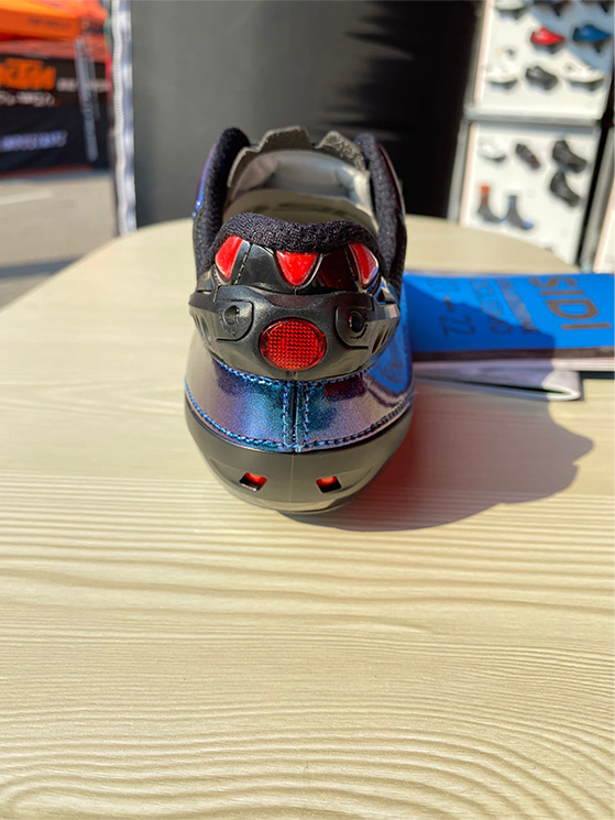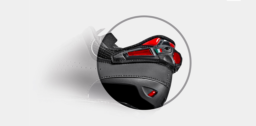 Nella parte posteriore troviamo il tallone integrato con un desing nuovo, più leggero e rinforzato per evitare eventuali deformazioni che avvengono durante gli sforzi prolungati. La struttura anatomicamente modellata sostiene e stabilizza il piede. Sidi ha aggiunto anche degli inserti reflex per una maggiore visibilità sulla strada. Sempre nella parte posteriore il Reflex Adjustable Heel Retention Device permette di chiudere la scarpa regolando ogni lato in modo indipendente e sicuro.