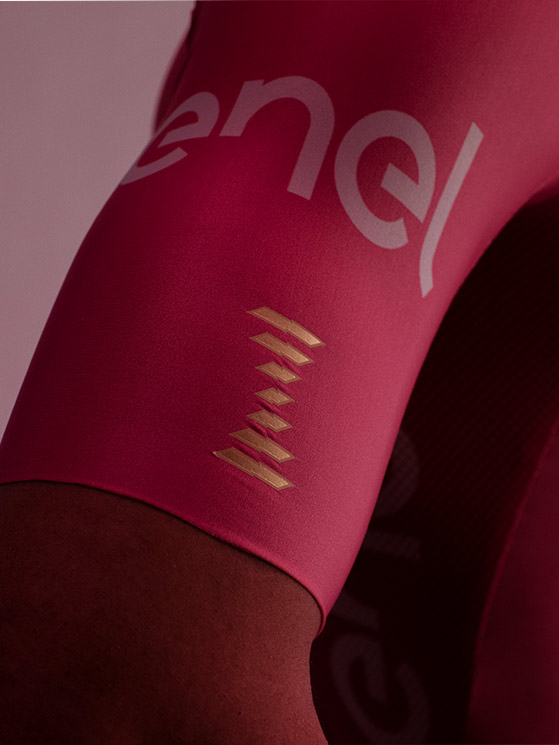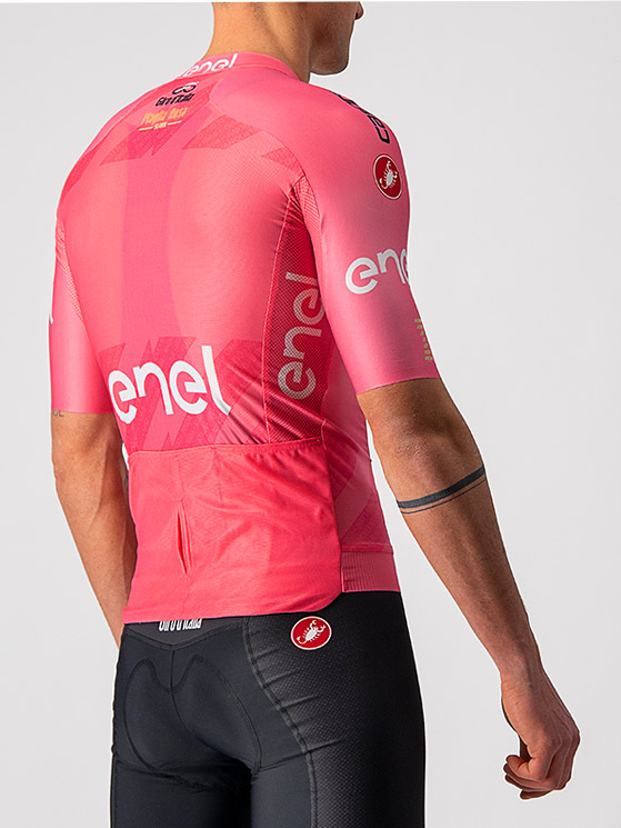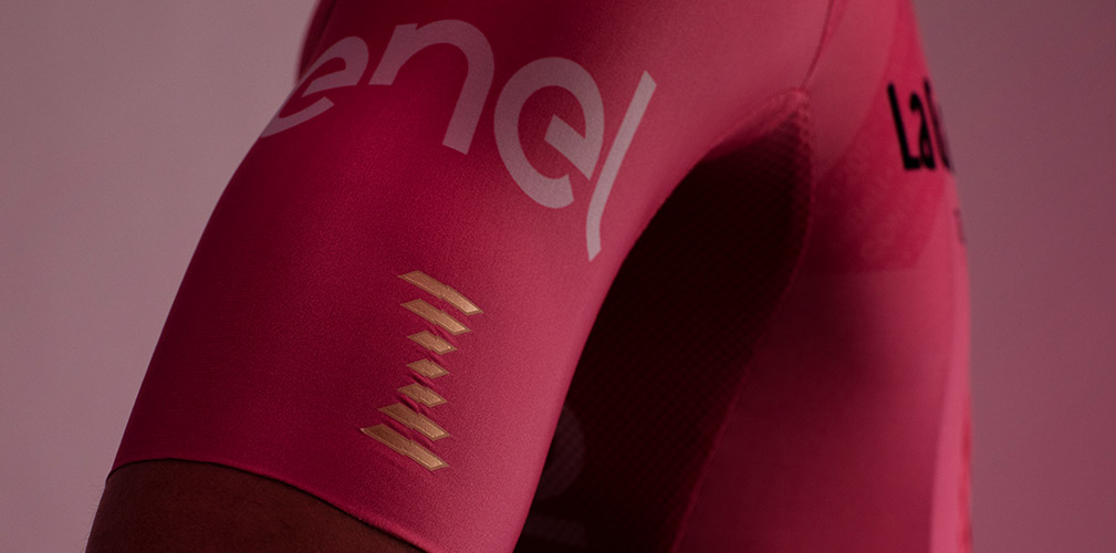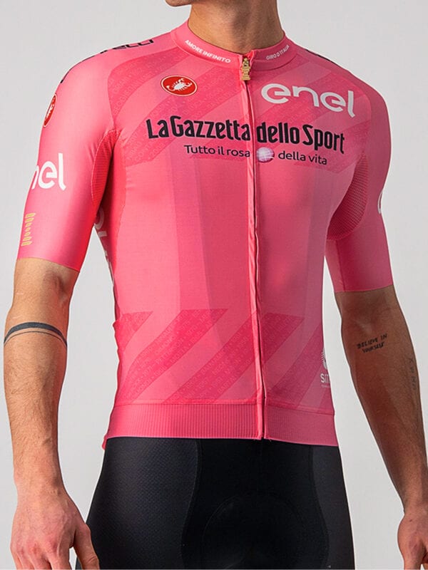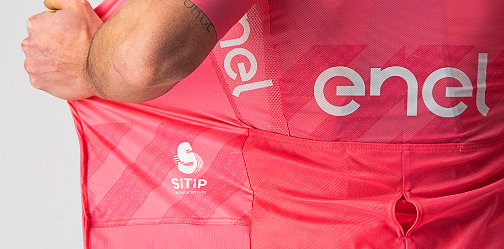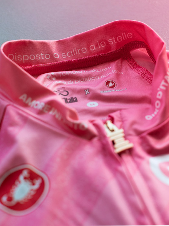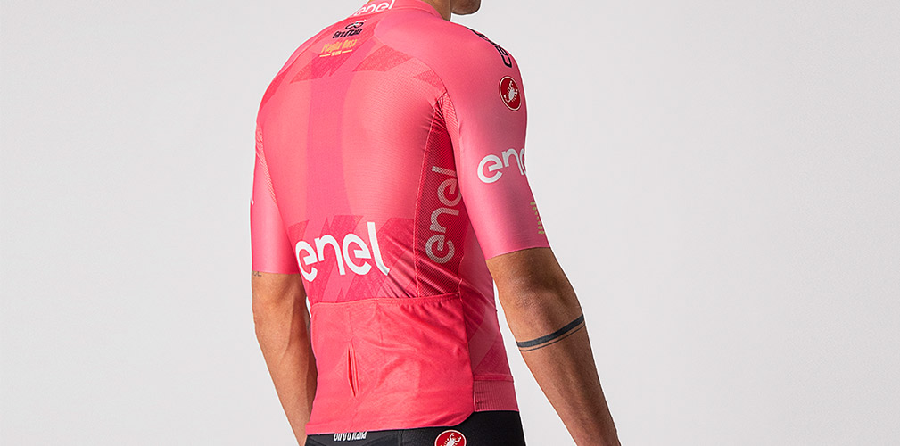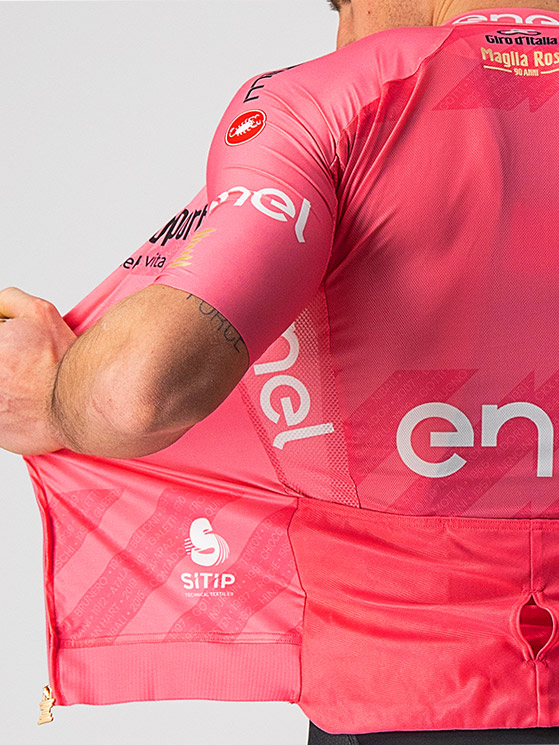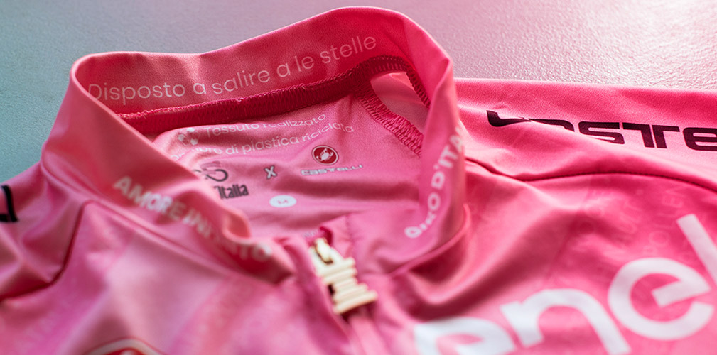 La maglia rosa è realizzata da Castelli che utilizza il tessuto NATIVE by Sitip