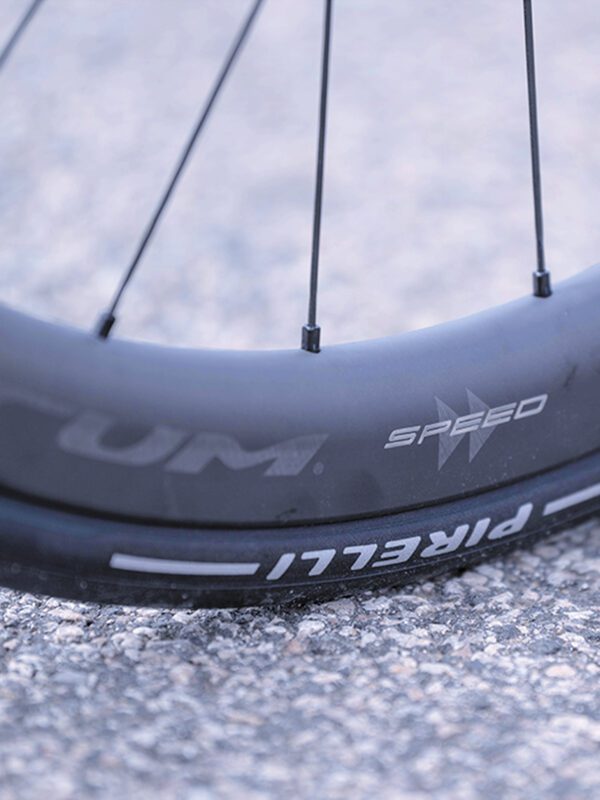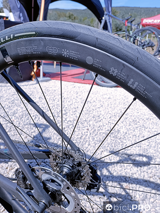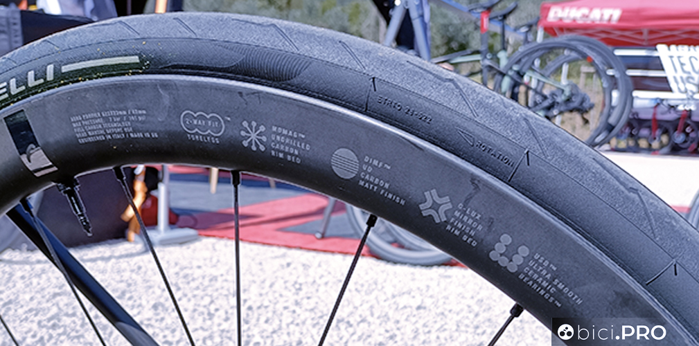 All’anteriore vi sono 16 raggi dal lato del disco e 8 nel lato opposto. Al contrario di ciò che accade nella ruota posteriore, più “robusta” nel lato della trasmissione. Il risultato è una deformazione torsionale migliore del 10% rispetto alle “vecchie” 40 e 55 mm. Non solo, ma questa soluzione rende le ruote bilanciate in tutto e per tutto.