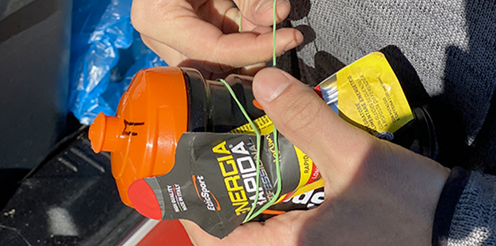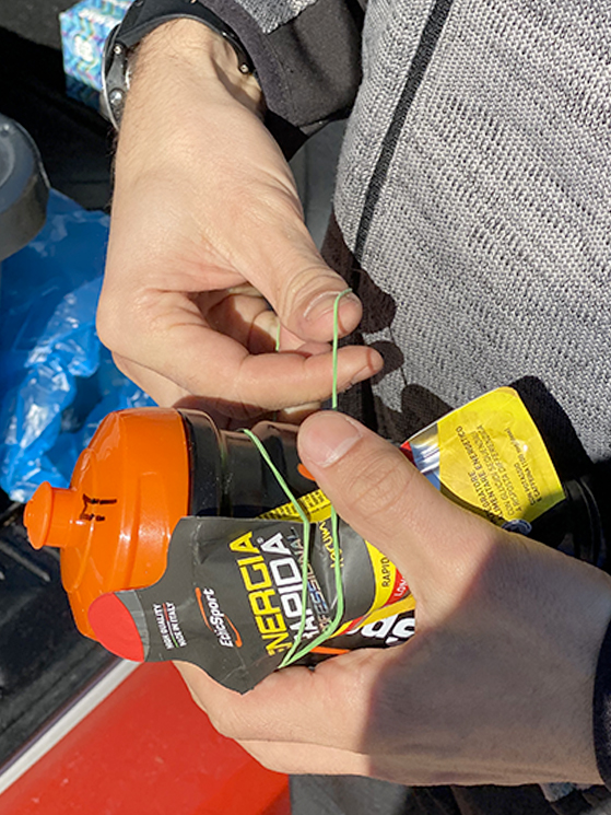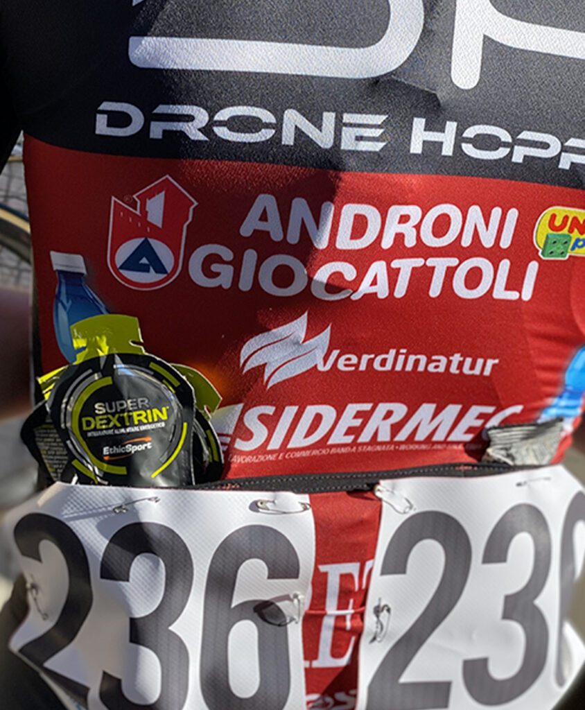 Un rifornimento di metà gara, con i gel a rilascio prolungato (foto Drone Hopper)