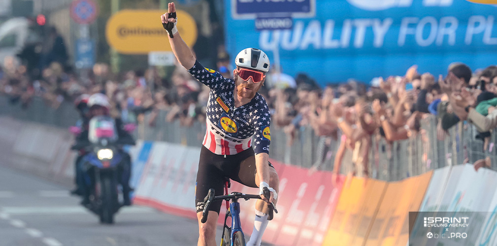 Tutti si aspettavano un monologo del bicampione del mondo e, invece, la lunga fuga di giornata che ha visto tra gli altri protagonisti anche un redivivo Michael Matthews e il nostro Filippo Ganna è stata l’azione che ha animato la classica delle foglie morte. Una giornata più estiva che autunnale viste le temperature sempre superiori ai 20 gradi. Con un vantaggio sempre attorno ai 3 minuti, gli attaccanti hanno tenuto viva la corsa e ai -82 chilometri da Bergamo. E’ stato proprio il ventiquattrenne del Colorado che ha lasciato la compagnia e ha provato l’impresa, facendo risplendere al sole la sua maglia a stelle e strisce.