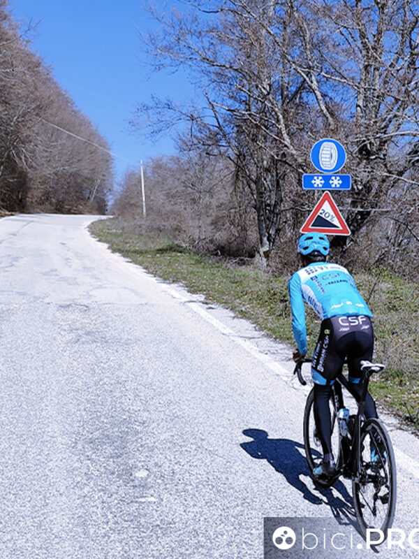 Il corridore laziale si è scaldato poco dopo il finale della salita precedente, cioè la lunga discesa che arrivava da Ovindoli, ed è partito per la scalata finale. Subito aveva un buon passo. Nonostante parlasse tranquillamente nel tratto in pianura, filava via sul filo dei 40 all’ora e in salita, pur viaggiando in Z2, era al di sopra dei 20 orari. Mentre saliva, si apriva il panorama e spiccavano le vette ancora imbiancate del gruppo del Sirente Velino.