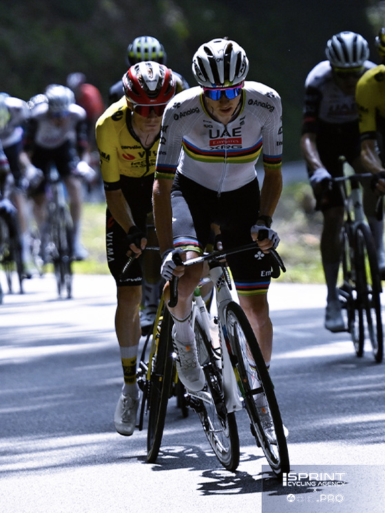 Analizziamo la corsa di Pogacar e della sua UAE Emirates. La squadra corre compatta attorno al suo leader, lascia addirittura l’onere della corsa alla Visma-Lease a Bike che tira sulla penultima salita. L’attenzione da parte di Pogacar è massima e addirittura manda Narvaez a rosicchiare il secondo d’abbuono rimasto al traguardo volante. Dettagli che parlano di una concentrazione massima, quasi feroce, famelica.