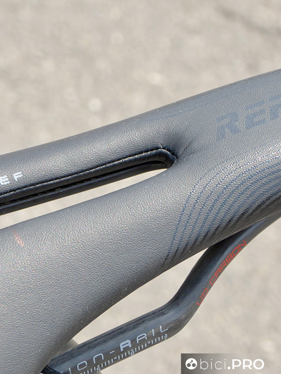 Lo scafo, vicino al canale anatomico è ben nascosto e protetto dalla cover. In questo punto il supporto è eccellente, grazie alla combinazione di un’imbottitura omogenea e di uno scafo che non tende mai ad abbassarsi in modo eccessivo. E poi c’è il piccolo spoiler che funge anche da giunto, bello da vedere, con la funzione meccanica di stabilizzare la sella. La copertura è in microfibra resistente all’acqua e alle abrasioni, mentre il foam è in EVA superleggera.