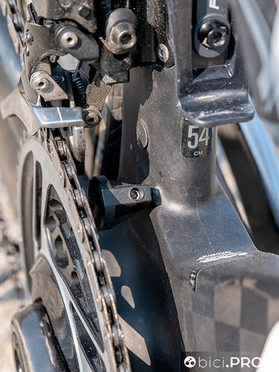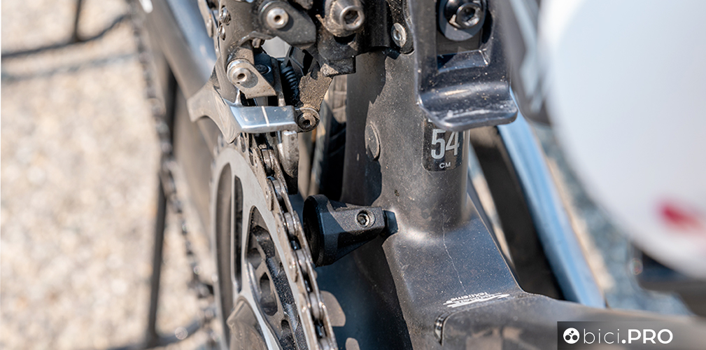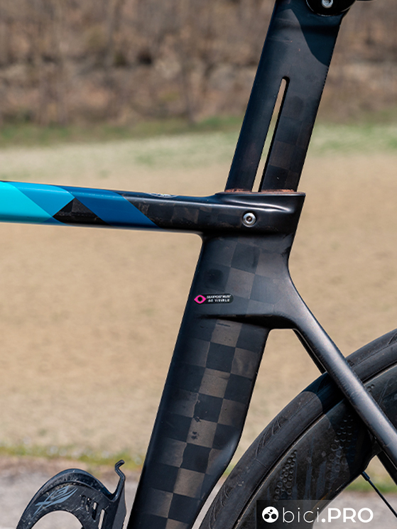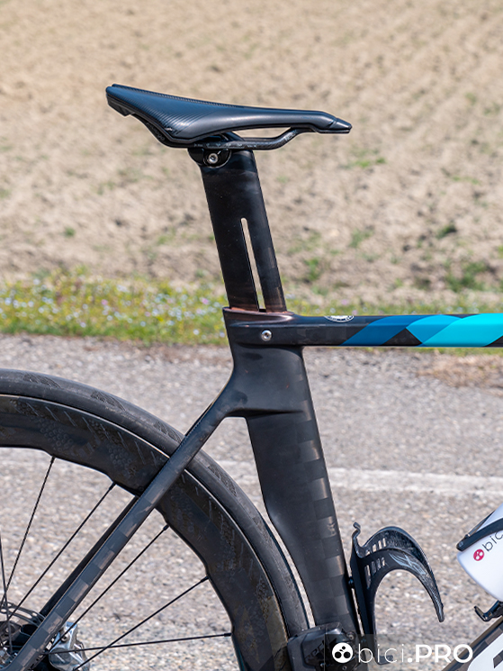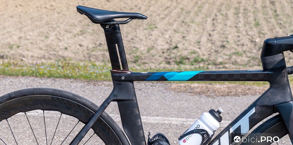 C’è l’attacco manubrio in alluminio, un granitico blocco in lega dalle forme squadrate. E’ rigidissimo, fattore che si percepisce in modo esponenziale quando si rilancia la bici con il peso del corpo tutto in avanti. E poi c’è anche il “reggisella alare” full carbon. Proprio ai lati si notano le due fessure, che da una parte fungono da binario per la regolazione dell’altezza sella, dall’altra si presentano con due cover siliconiche per non sacrificare l’efficienza aerodinamica. Il valore alla bilancia rilevato è di 7,8 chilogrammi (senza pedali).