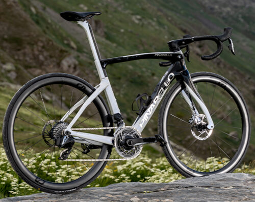Una livrea full black alterna delle sezioni opache ad altre brillanti. Il kit telaio full carbon (la fibra di carbonio è la Toray T700) comprende anche il seat-post (specifico), la forcella, anch’essa tutta in carbonio e il cockpit Most in alluminio. La scatola del movimento centrale mantiene le calotte esterne, come vuole la tradizione Pinarello.