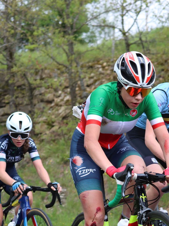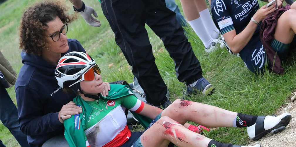 Nella prima tappa avevo buone sensazioni, la gamba rispondeva. Sono rimasta nel primo gruppo, ma alla fine nessuna di noi è finita nella top 10 e alla fine eravamo tutte un po’ deluse, alla sera l’atmosfera era un po’ mesta. Il secondo giorno c’erano più salite, lo scorso anno ero andata piuttosto bene con la nazionale e mi ricordavo il percorso, così nella prima parte sono entrata nel gruppetto di testa. In discesa siamo andate via in 5 e abbiamo preso anche un bel vantaggio, quasi un minuto. A metà corsa però una spagnola mi è caduta davanti e non ho potuto evitarla.
