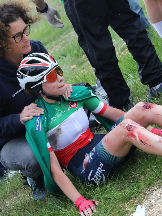 Un po’ sulla stessa linea di com’è andata la trasferta francese. La sfortuna sembra non voglia lasciarmi, lasciare questa maglia tricolore. Avendo strusciato sull’asfalto, quella caduta mi ha procurato ustioni di secondo grado su entrambe le gambe e mi ha costretta a fermarmi. Ma anche prima le cose non erano andate benissimo, tra crampi e condizione che faticava ad arrivare.