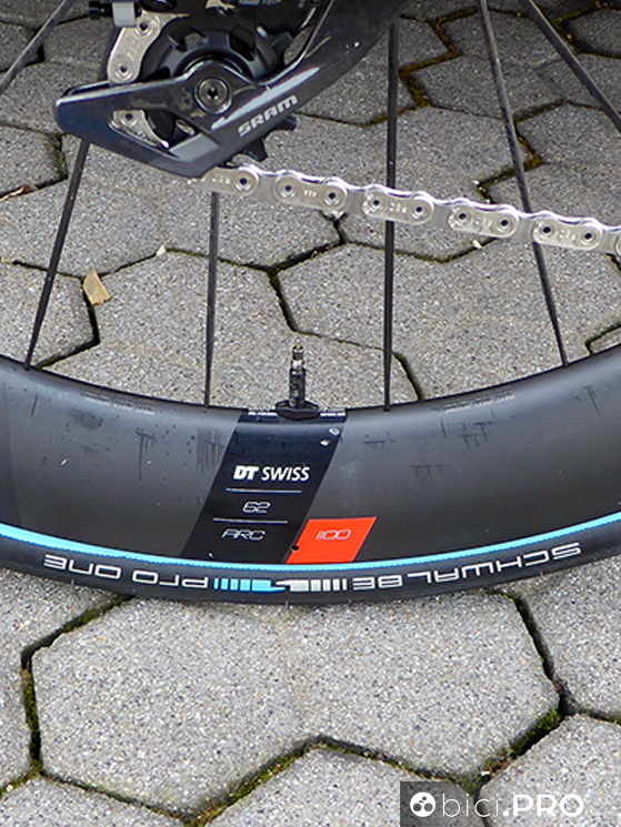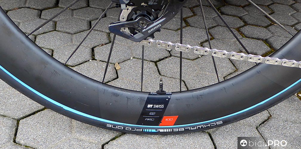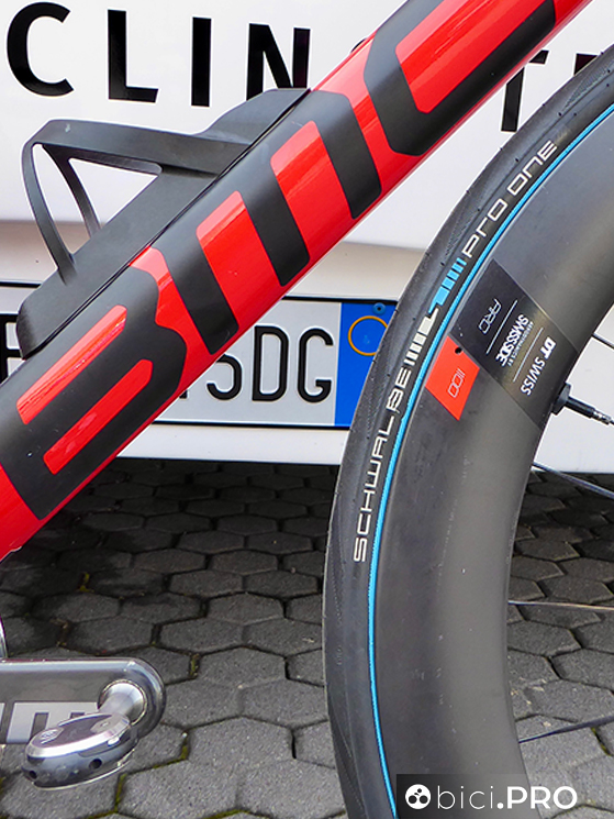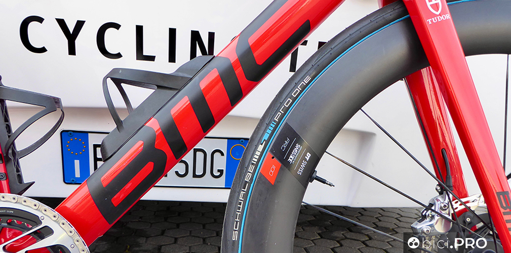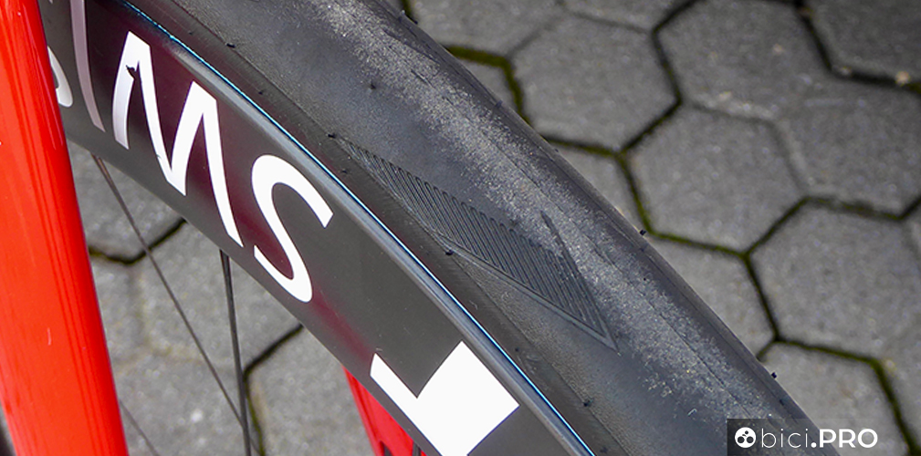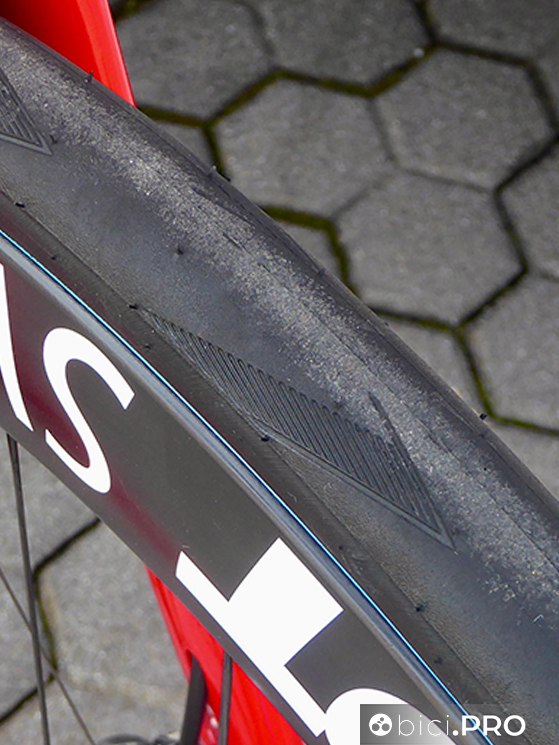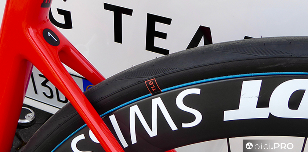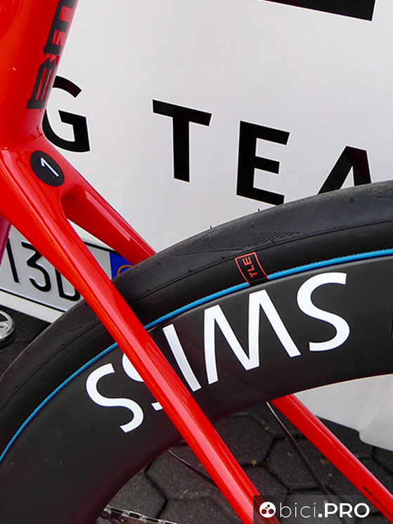 Gli pneumatici sono gli Schwalbe Pro One e quelli con la banda blu sono un versione dotata di una nuova mescola, più scorrevole, come abbiamo documentato nella giornata di sabato che ha preceduto La Classicissima. Le ruote sono il modello ARC1100 con mozzi Dicut della serie 180.