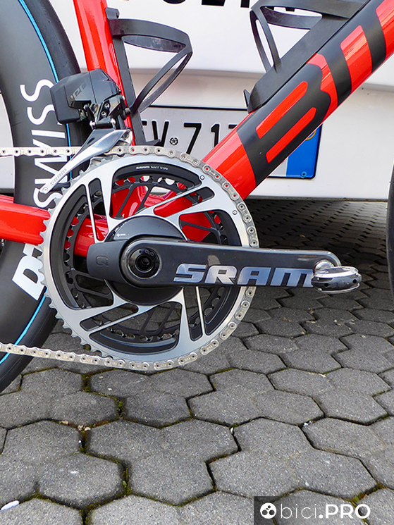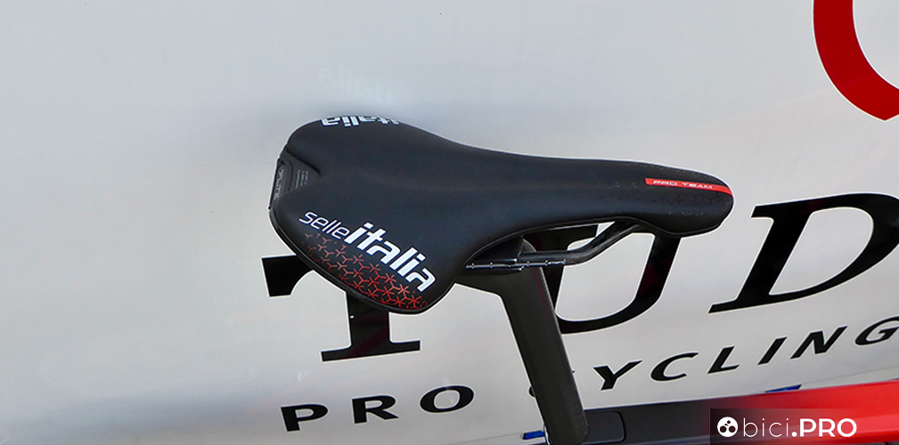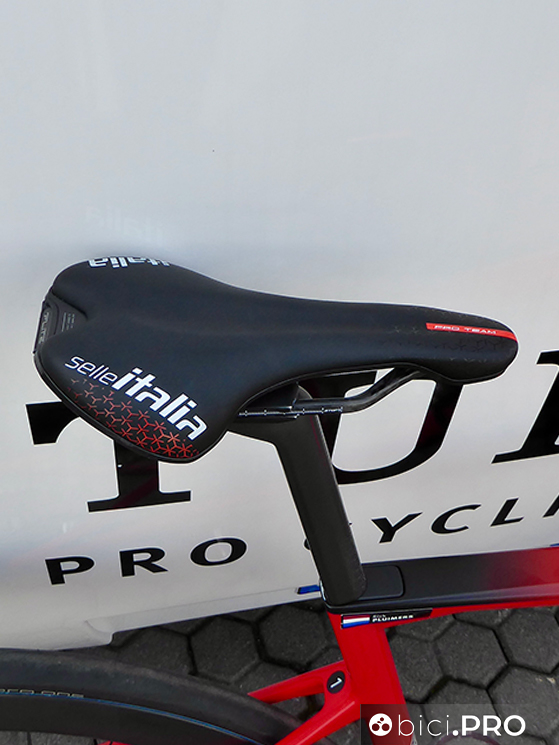 Buona parte dei corridori utilizzano la Flite Boost, che nella versione SuperFlow con canale di scarico, chi nella versione senza foro. Qualcuno usa la SLR, sempre in versione corta (Boost). Ci sono i pedali Wahoo, senza power meter che invece è il Quarq integrato nella pedivella.