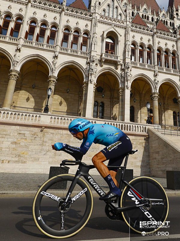 A Budapest i corridori del team kazako hanno corso con guarnitura 44-58 e pignoni 11-30. Ruote Corima Chrono Three Spokes all’anteriore e Corima Disc C+ al posteriore con gomme Vittoria da 25.