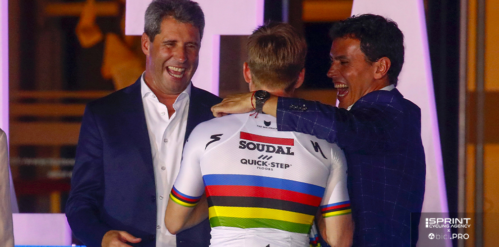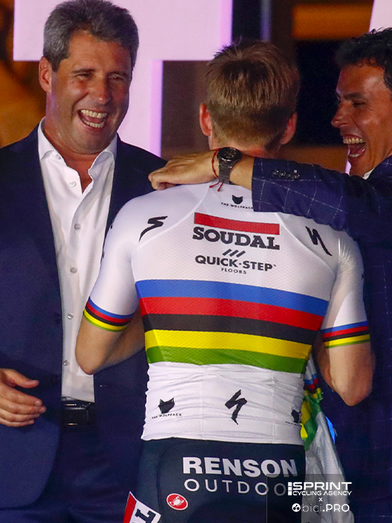 Evenepoel accolto sul palco dal Governatore Sergio Unac, a sinistra, e il sottosegretario allo sport Jorge ChicaEvenepoel accolto sul palco dal Governatore Sergio Unac, a sinistra, e il sottosegretario allo sport Jorge Chica