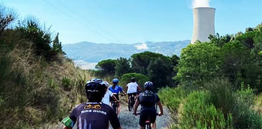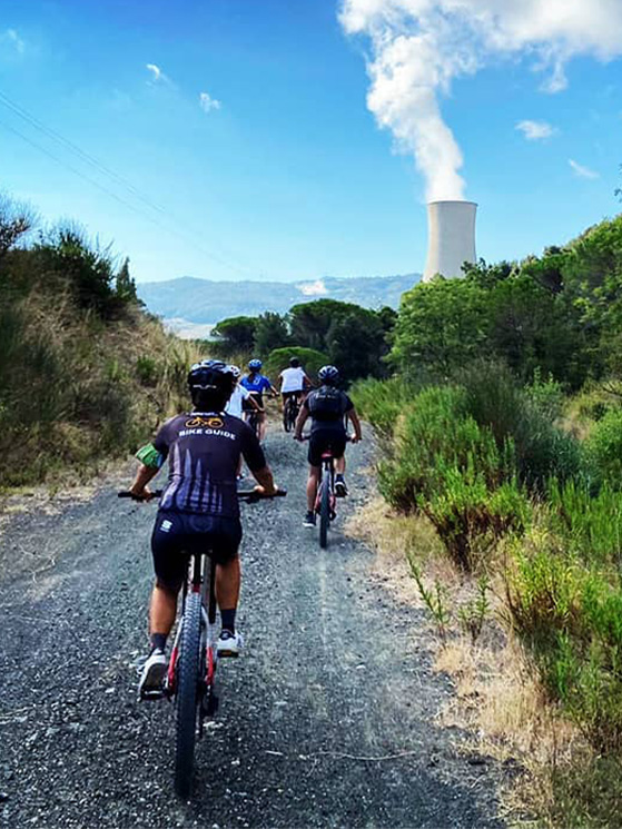 I clienti poco allenati di Tuscany Love Bike possono contara su e-Mtb per pedalare sulle strade bianche Cipressi e strade bianche caratterizzano l’entroterra della Val di Cecina Tuscany Love Bike accompagna i propri gruppi sia sulle strade dei campioni sia su quelle meno conosciute Le centrali geotermiche e i soffioni boraciferi fanno parte del panorama attorno a Larderello