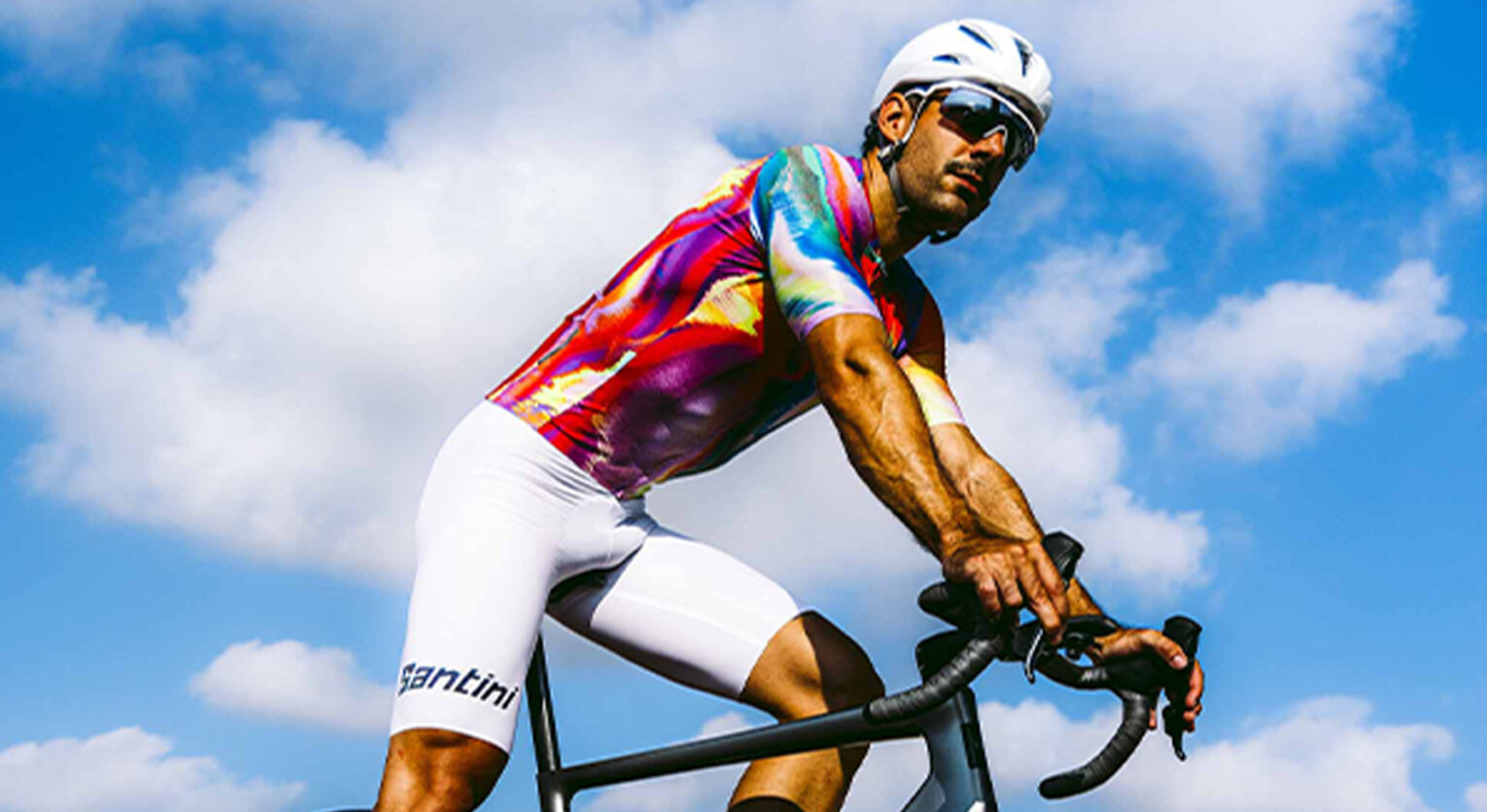 I pantaloncini Unico erano già presenti nella collezione di Santini, ma la novità dell’estate 2025 sono i colori. Ai già presenti nero, blu navy e burgundy (una sorta di bordeaux scuro) si aggiunge infatti un classico bianco, ma con un dettaglio all’avanguardia nelle bretelle. Tutta l’area interna superiore ha una grafica multicolor dal sapore psichedelico.