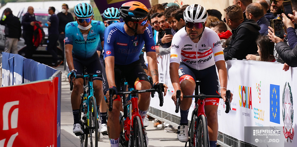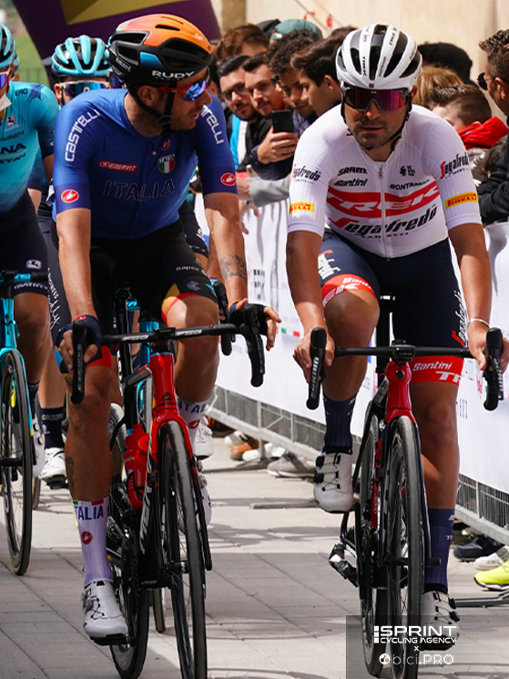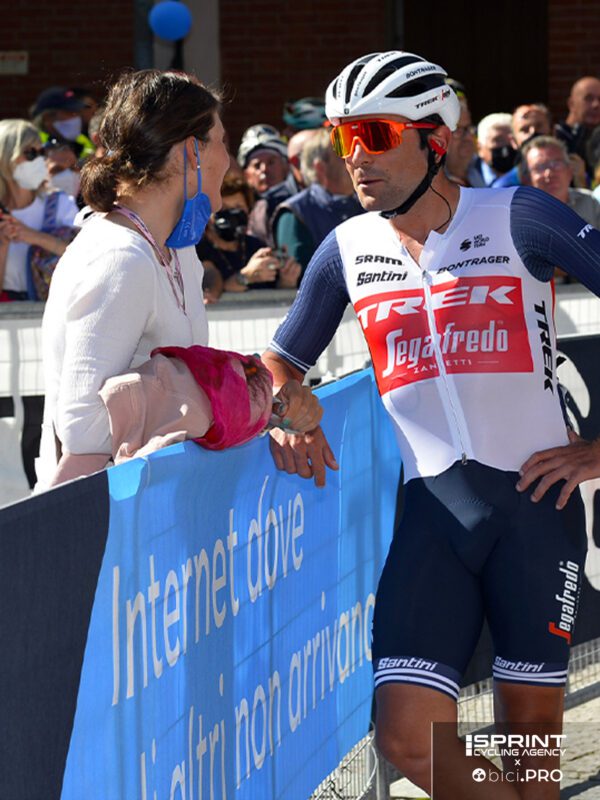 Pedivelle da 165 millimetri e ruote Enve 4.5 con profilo differenziato (50 millimetri all’anteriore e 56 al posteriore) con i mozzi color argento, nuovi e visti in anteprima al Giro. La posizione della sella Fizik Argo (creata con mappatura specifica e su misura) è tutta in avanti e parecchio scaricata verso il basso