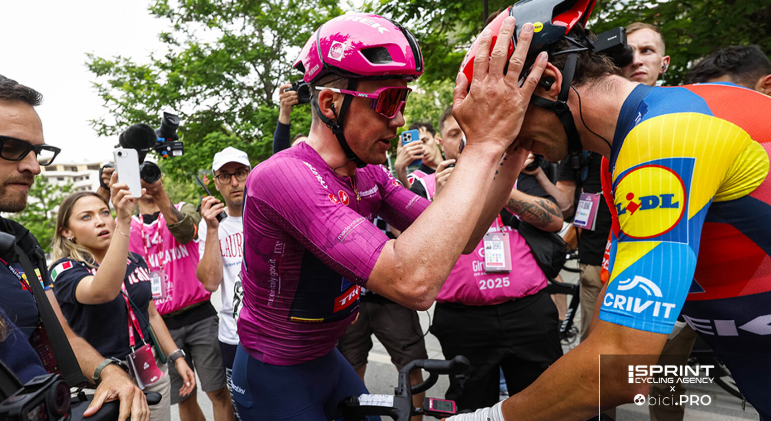 Il diretto interessato dopo l’arrivo ha ricevuto l’abbraccio della maglia rosa (foto di apertura), poi ha ripreso fiato, ha bevuto e reintegrato i primi zuccheri e poi ha parlato con la solidità che lo contraddistingue da qualche tempo a questa parte. Merito, come dice Guercilena, di sua moglie, ma anche della maturazione atletica e del vivere le corse senza apparente pressione.