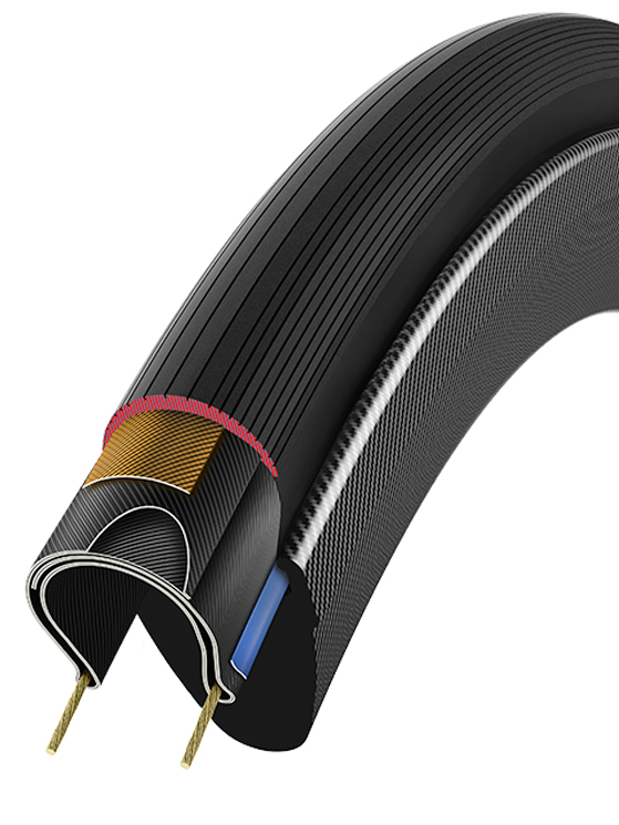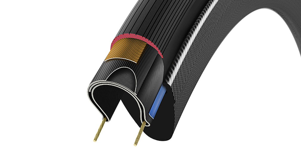 Partendo dallo scheletro del Corsa N.EXT, la nuova carcassa è in nylon 100 Tpi, soluzione comune alle due versioni (clincher e tubeless ready). La struttura prende forma grazie a tre strati di nylon sovrapposti che inglobano anche il cerchietto (che è pieghevole). In questa zona è stata aggiunta una bandella di rinforzo, che protegge lo stesso cerchietto e irrobustisce il tallone. Nella parte superiore, tra la carcassa e il battistrada c’è un inserto protettivo, utile contro le forature e che influisce positivamente sulla durata della gomma. Ma non è tutto, perché questo inserto non è applicato a caso, in quanto non deve influire in modo negativo sulla scorrevolezza.
