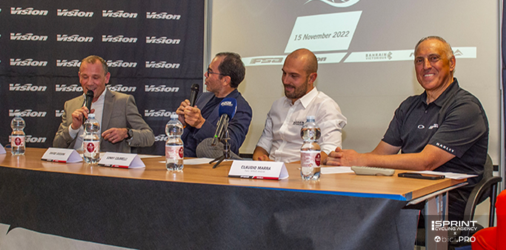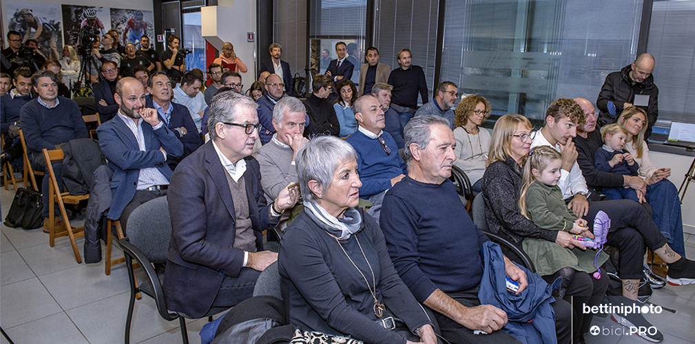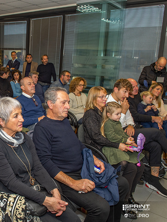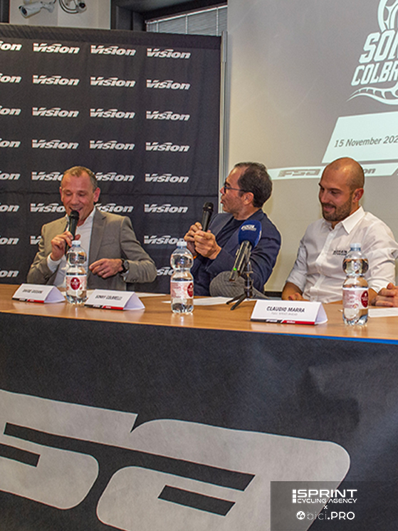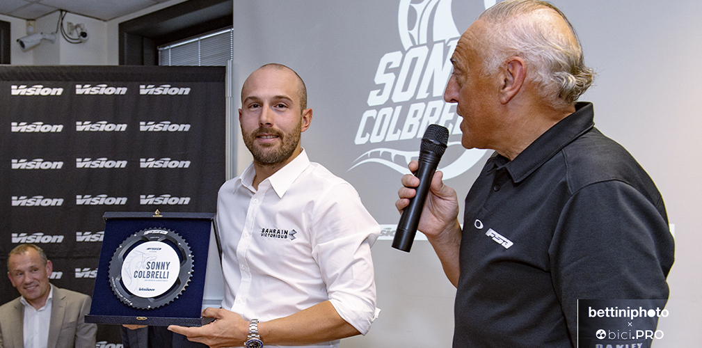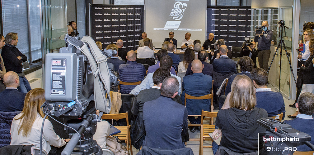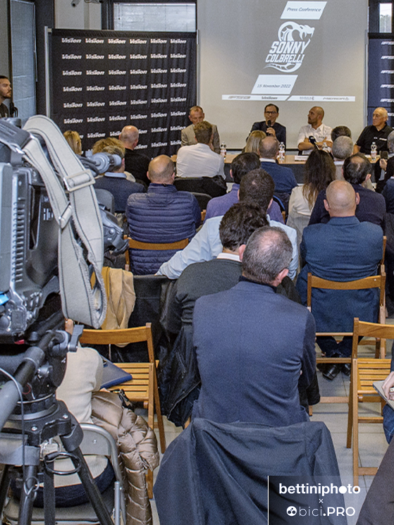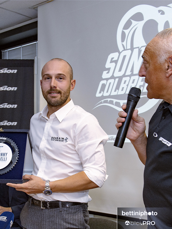 Scorrono le immagini delle vittorie. Poi viene presentato il logo con il cobra e il nome Sonny Colbrelli, disegnato da Johnny Mole per una linea di 71 bici Merida volute da Sonny, perché 71 era il numero sulla maglia nella Roubaix vinta. Intervengono Claudio Marra, il padrone di casa, che gli consegna un premio. Interviene Dario Acquaroli, per Merida Italy. E intervengono anche due pezzi grossi di Merida Europe: il direttore del marketing Andreas Rottler e il general manager Wolfgang Renner. E Sonny, già più disteso parla del progetto e della sua idea di lavorare per il ciclismo dei bambini.