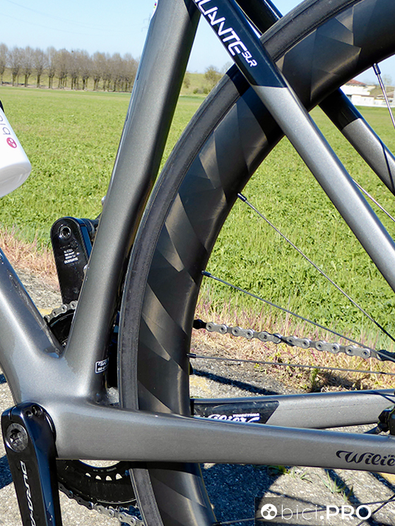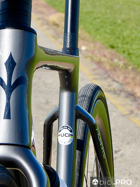 E poi c’è quel passaggio ampio nella forcella e nel carro posteriore, un altro dettaglio che fa aumentare il valore tecnico della Filante SLR e non comune a questa categoria di biciclette. I due passi ruote sono ampi e lasciano parecchia luce tra pneumatico e profilati (obliqui e foderi della forcella).