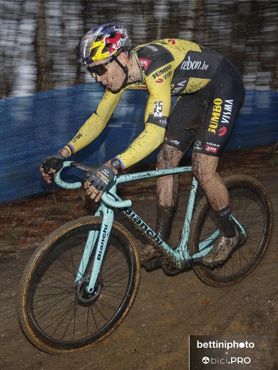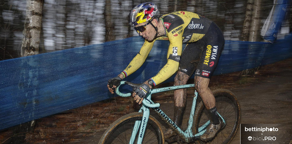 Siamo in piena stagione di ciclocross e il mondiale si avvicina, con i due fenomeni della disciplina che continuano a suonarsele di santa ragione. Come ormai tutti sanno la Jumbo-Visma di Wout Van Aert ha cambiato biciclette passando da Bianchi a Cervélo. Ma siccome il marchio canadese non ha in gamma una bici da ciclocross, Van Aert continuerà la stagione con la sua nuova Bianchi Zolder Pro verniciata con i colori della Jumbo Visma (foto di apertura).