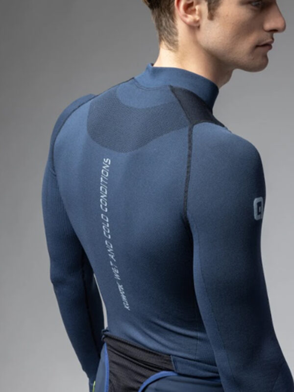 Ora andiamo più nel dettaglio della maglia. Come accennato all’inizio Klima è un base layer a maniche lunghe, con un colletto a mezza altezza che protegge la gola dall’aria fredda. La costruzione è seamless. Questo significa che i diversi pannelli – ad intensità diversificata a seconda delle zone – sono uniti senza cuciture, cosa che garantisce comfort ed elasticità.