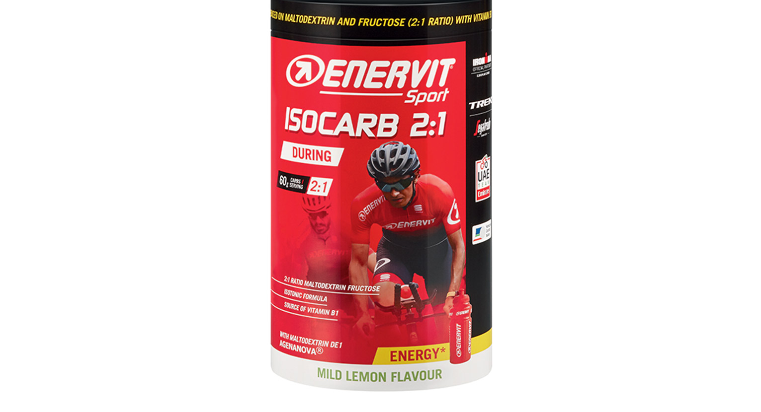 Enervit Sport Isocarb 2:1 è la nuova bevanda isotonica istantanea a base di maltodestrine Agenanova DE1 e fruttosio, con vitamina B1, fonte di sodio, senza coloranti e con aroma naturale di limone. La nuova bevanda è nata dalla collaborazione con il Team Trek-Segafredo e UAE Team Emirates.