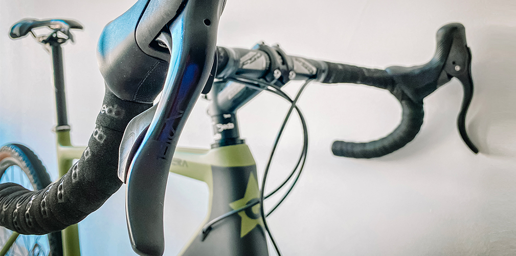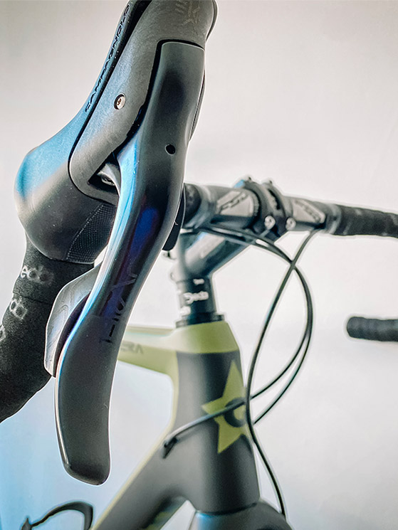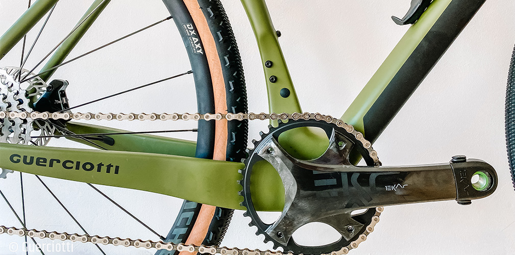 Equipaggiata con campagnolo Ekar 1×13 (la guarnitura si può scegliere fra 38-40-42-44, mentre i pacchi pignoni disponibili sono tre: 9-36, 9-42 e 10-44) la Guerciotti Brera offre il vantaggio di esplorare itinerari fuoristrada in totale armonia e comfort. Singolare per chi non ha l’occhio allenato rendersi conto che il comando al manubrio è solo uno, dato che c’è da controllare soltanto il deragliatore posteriore. Ugualmente il manubrio presenta una svasatura che consente di applicare una borsa. Per aumentare la rigidità dell’insieme, in linea con gli ultimi orientamenti, si è scelto il montaggio con perno passante. Le uniche resistenza a questa soluzione vengono purtroppo soltanto dalla strada, mentre gravel e mountain bike l’hanno sposata da un pezzo.