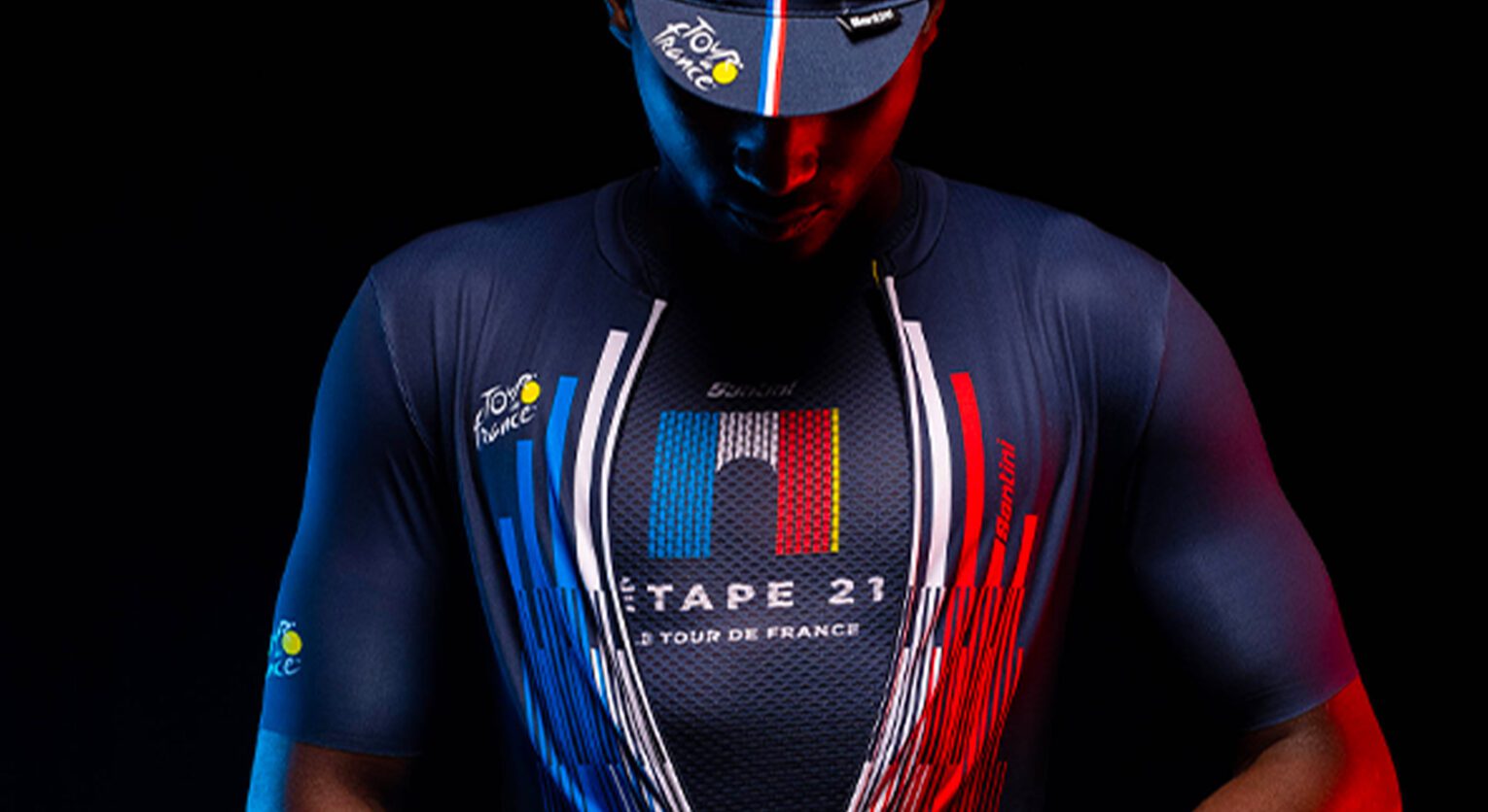 Ogni anno Parigi accoglie i corridori e accompagna i festeggiamenti conclusivi dell’arrivo del Tour de France. In occasione della 21ª tappa i cieli sopra la Ville Lumière, diventano teatro della spettacolare esibizione de La Patrouille de France, che disegna scie nell’aria con i colori della bandiera francese. Proprio queste tracce nel cielo sono protagoniste del design della maglia Santini Trionfo. Infatti campeggiano sul fronte e sul retro del capo ricreando la pennellata tricolore che pian piano svanisce. Un altro riferimento alla tappa iconica è presente sulla maglia intima, cappellino e calzini. L’Arco di Trionfo colorato di blu, bianco e rosso.