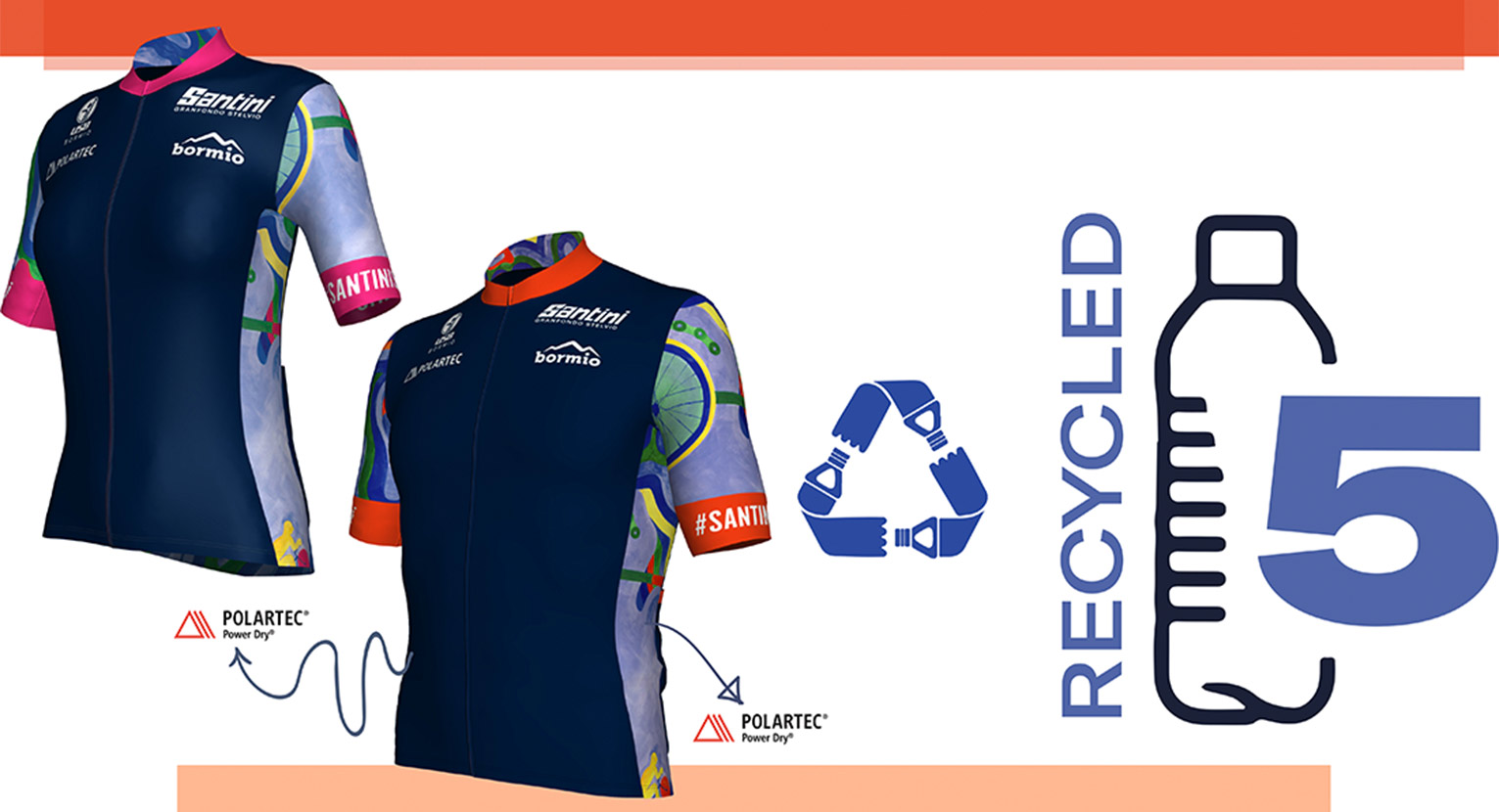 In occasione della Gran Fondo Stelvio Santini 2021 il marchio italiano realizzerà in collaborazione con Polartec una maglia ottenuta dalla riconversione delle bottiglie in PET. I tessuti utilizzati sono il Polartec Power Dry recycled e il Polartec Delta recycled.