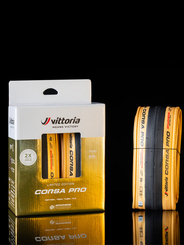 Questa versione in edizione limitata vuole celebrare un anno straordinario, costellato di vittorie. Corsa PRO Gold Limited Edition è disponibile in confezioni double-pack numerate, contenenti due pneumatici tubeless-ready con fianchi dorati e con numero seriale scritto a mano all’interno del copertoncino. Sono disponibili solo 2023 confezioni in tutto il mondo, il che lo rende un oggetto molto desiderato da chi ama il ciclismo.