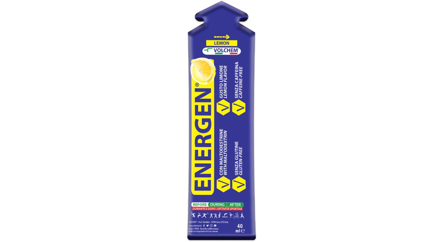 Energen di Volchem è un gel in monodose, dalla consistenza di uno sciroppo, da 40 ml che fornisce ben 62 kcal. L’apporto di carboidrati è di 15 g ma solamente 2,9 sono sotto forma di zuccheri semplici. Il resto sono carboidrati complessi, maltodestrine derivanti dal mais, con la capacità di fornire energia in modo rapido, senza però aumentare eccessivamente il picco glicemico del sangue.