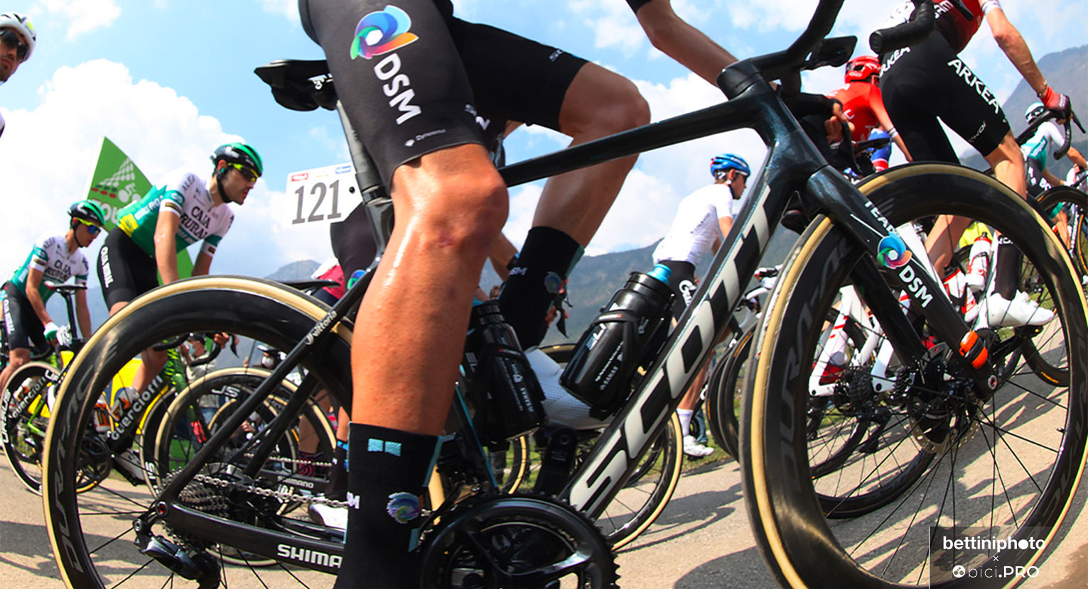 La nuova Scott Addict RC del Team DSM è una bici leggera, reattiva. A primo impatto sembra essere studiata per gli scalatori (in apertura le gambe e la bici di Romain Bardet al Tour of the Alps), ci sono però alcuni aspetti che vanno approfonditi con maggiore attenzione.