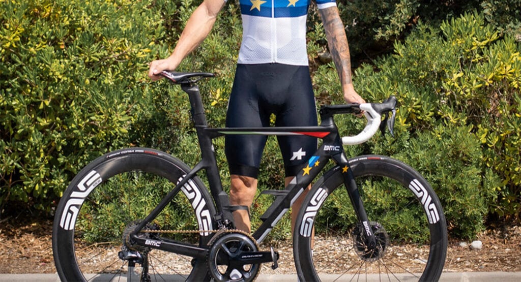 La BMC Timemachine Road è una delle biciclette in dotazione al Team NTT ed è quella usata da Nizzolo nelle vittorie del Campionato Italiano ed Europeo. Oltre alla ricerca dei profili aerodinamici e al manubrio con profilo alare, anche BMC ha cercato di conferire un buon grado di comfort tramite la tecnologia TCC Tuned Compliance Concept. Con questo sistema ogni modello della casa elvetica viene realizzato con una differente flessibilità verticale. L’obiettivo è avere l’equilibrio migliore fra la rigidità laterale e quella verticale. Per quanto riguarda le geometrie questa bicicletta ha dei valori meno estremi, infatti se consideriamo l’angolo di sterzo, si parte da un minimo di 71,2 gradi per la taglia più piccola fino ai 72 gradi del telaio più grande.