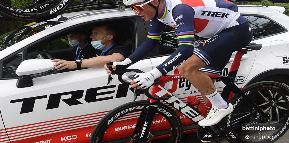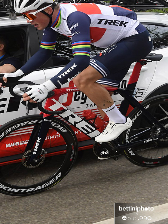 La Trek Madone con cui pedalano gli atleti del Team Trek-Segafredo, è una delle biciclette aerodinamiche più famose e con delle soluzioni tecniche molto interessanti. Oltre alle doti aerodinamiche, Trek ha pensato anche al comfort con il sistema Isospeed. In pratica grazie a una semplice regolazione è possibile modificare l’elasticità del telaio e assorbire le vibrazioni in maniera diversa. In questo modo ogni ciclista può trovare l’assetto che preferisce in base al tracciato o alle condizioni fisiche del momento. La Madone vanta una geometria aggressiva con l’angolo del tubo sterzo che nella taglia più grande è di 73,9 gradi, vale a dire un angolo molto chiuso che va a favore della reattività dell’avantreno.