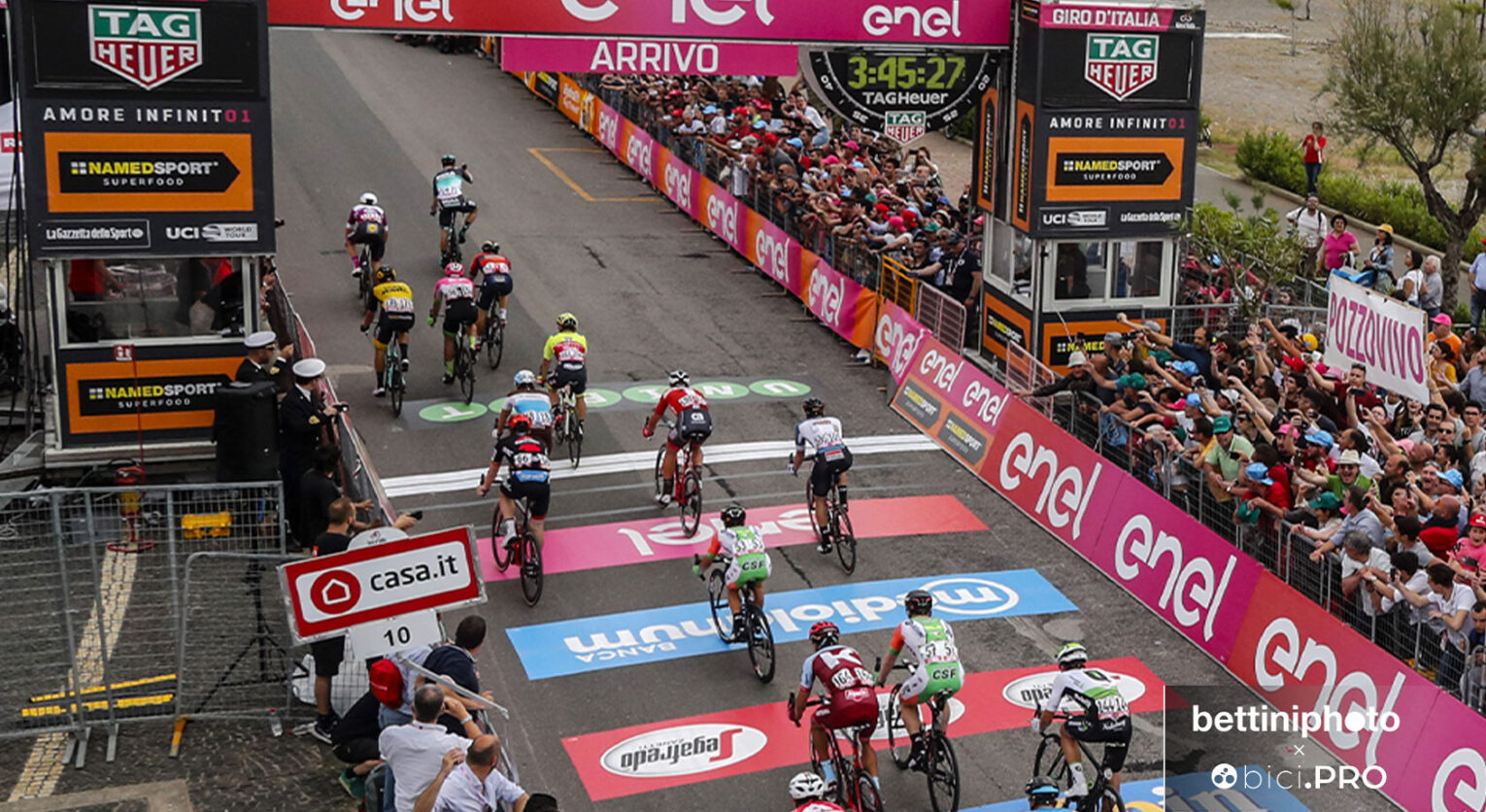 La differenza di statura e postura tra Ewan (casco rosso) e Van Aert (caso nero-giallo). Sprint della prima tappa della Tirreno 2021