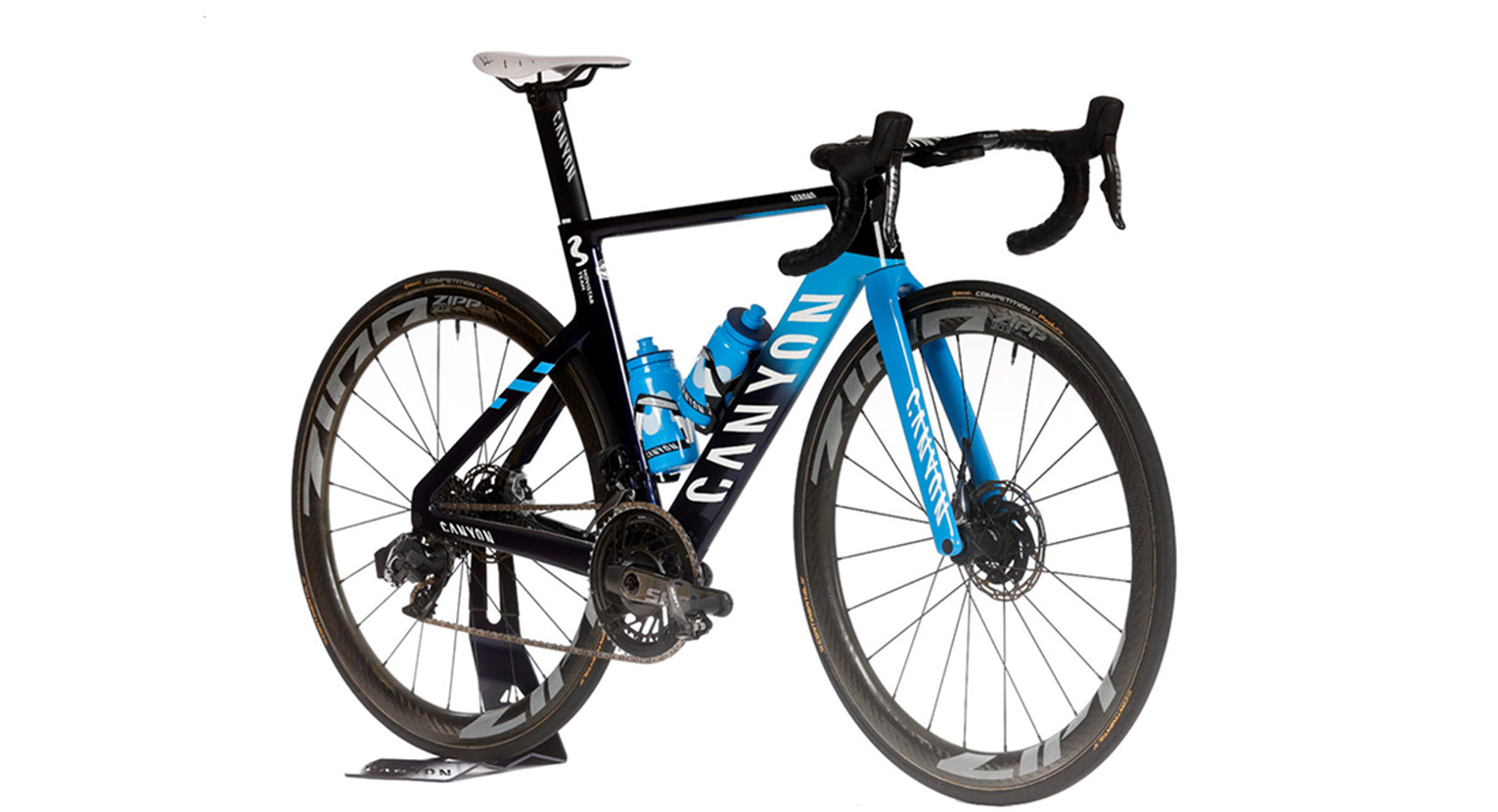 Per le prove contro il tempo i corridori del Team Movistar possono contare sulla Speedmax CF SLX equipaggiata con i freni tradizionali. Il manubrio di Canyon è stato progettato per offrire un gran numero di regolazioni. Le appendici sono pensate per favorire la posizione più confortevole e avere il miglior controllo possibile della bicicletta. La versione usata dal Team Movistar è la penultima ideata dal marchio tedesco, con una linea dei tubi più sfinata rispetto all’ultimo modello. Per le cronometro viene usata al posteriore la ruota lenticolare Super9 di Zipp, mentre all’anteriore viene montata la Zipp 454 NSW.