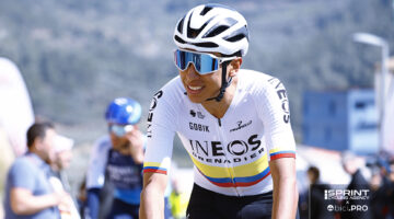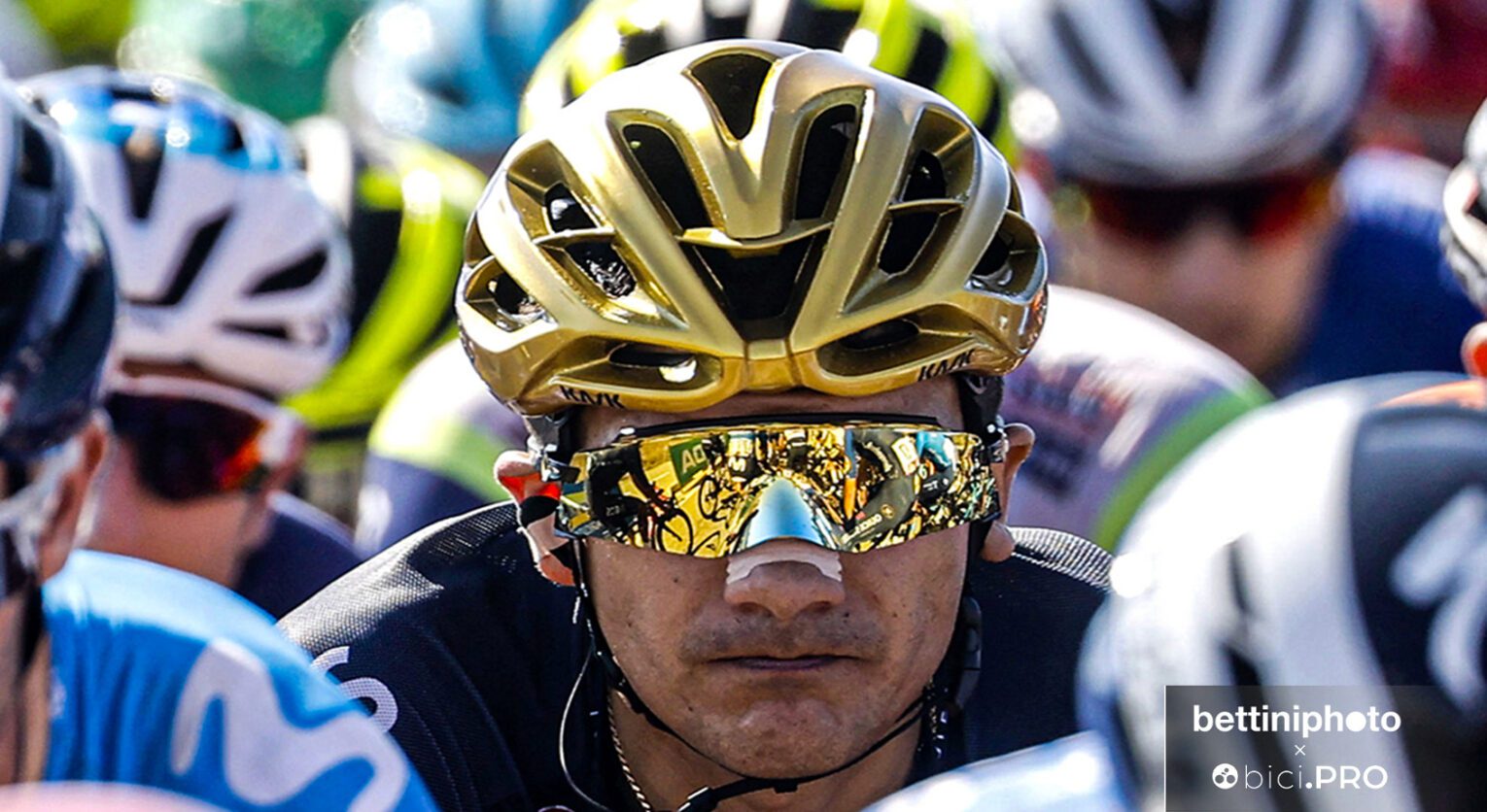 Come ben si può vedere dalla foto di apertura, mentre Carapaz lotta tutti i giorni alla Vuelta, anche Kask e Oakley si sono allineati con un casco e occhiali d’oro. Casco modello Protone Wg11 che dal blu Ineos nella parte posteriore sfuma fino all’oro della parte anteriore. Mentre è dorato anche il riflesso delle lenti Oakley.