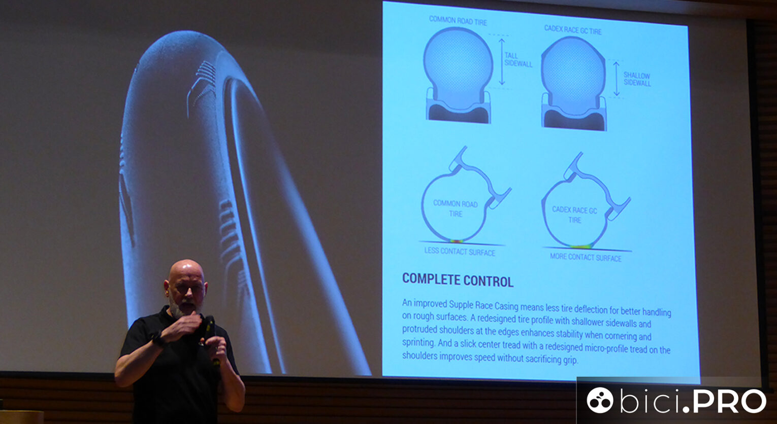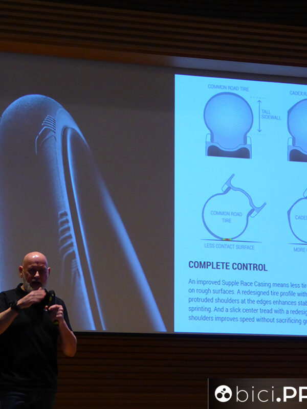 Rimanendo in ambito Cadex, visto che abbiamo le ruote combinate con gli pneumatici, la loro carcassa è il risultato di un blend di fibre di Kevlar e fili di carbonio. Significa che lo stesso pneumatico tubeless può resistere di più a pressioni elevate, rispetto ad uno pneumatico standard. Inoltre la struttura così composta aiuta a mantenere il design originale della gomma, senza che questa si dilati verso l’esterno, spanciando oltre i bordi del cerchio.