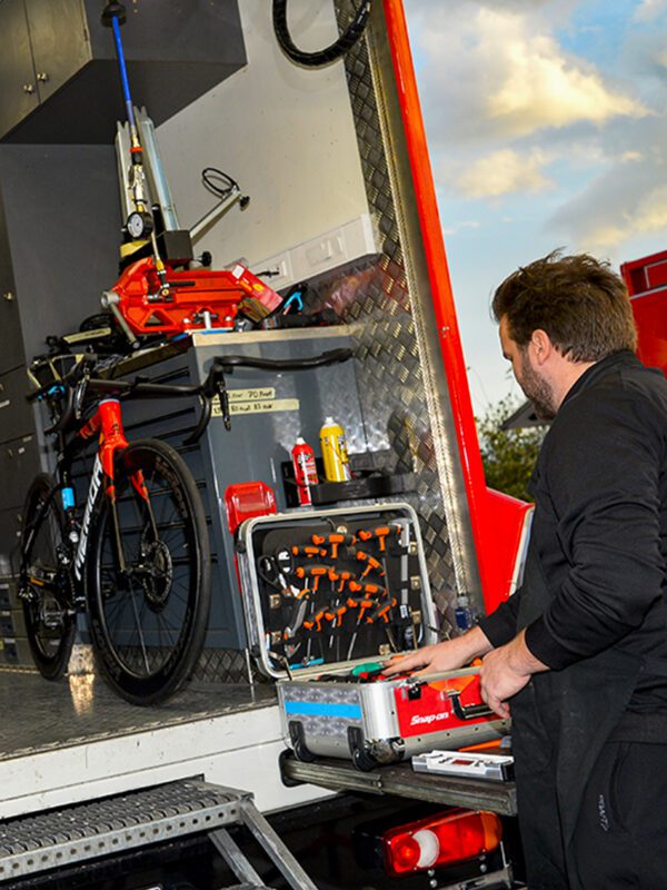 Si, perché c’è sempre bisogno di qualcosa e di supporto. Dovete pensare che nel corso della stagione ci sono i vari gruppi che sono posizionati nei diversi punti dell’Europa. Ad esempio quando è in corso la campagna del Belgio, un gruppo di corridori è in Spagna ad allenarsi, oppure ci sono più gare in contemporanea. Il magazzino ha due meccanici fissi, che si occupano dei mezzi, dei materiali per i corridori e della gestione del magazzino in generale. A questi si aggiungono altre due persone che si occupano di tutto quello che è slegato dalle biciclette. Abbiamo anche un autista, sembra banale, ma ci dà una grossa mano con i vari spostamenti, da e per gli aeroporti.