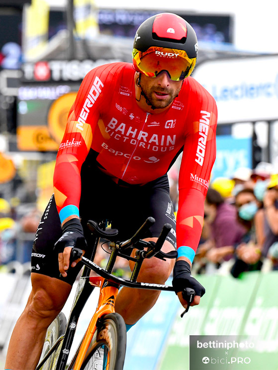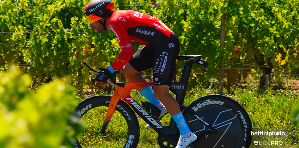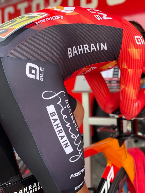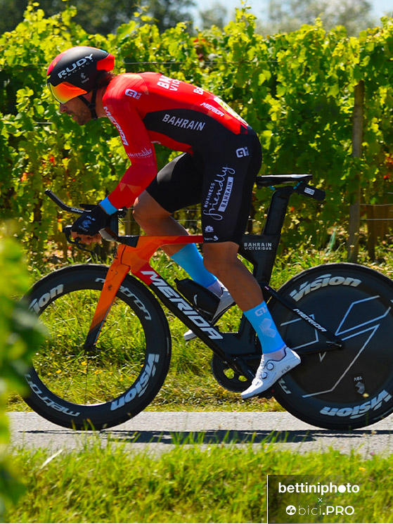 Il primo a partire della Bahrain Victorious è stato Marco Haller alle 13,27. Crono finale del Tour de France 2021: 30,7 chilometri da Libourne a Saint Emilion. Bici Merida Wrap TT e un body tutto nuovo, lo Space Jet, fornito da Alé per le prove contro il tempo. Il Tour de France volge al termine e la squadra guidata da Franco Pellizotti ha potuto utilizzare il nuovo capo speciale messo a punto proprio per la corsa francese.