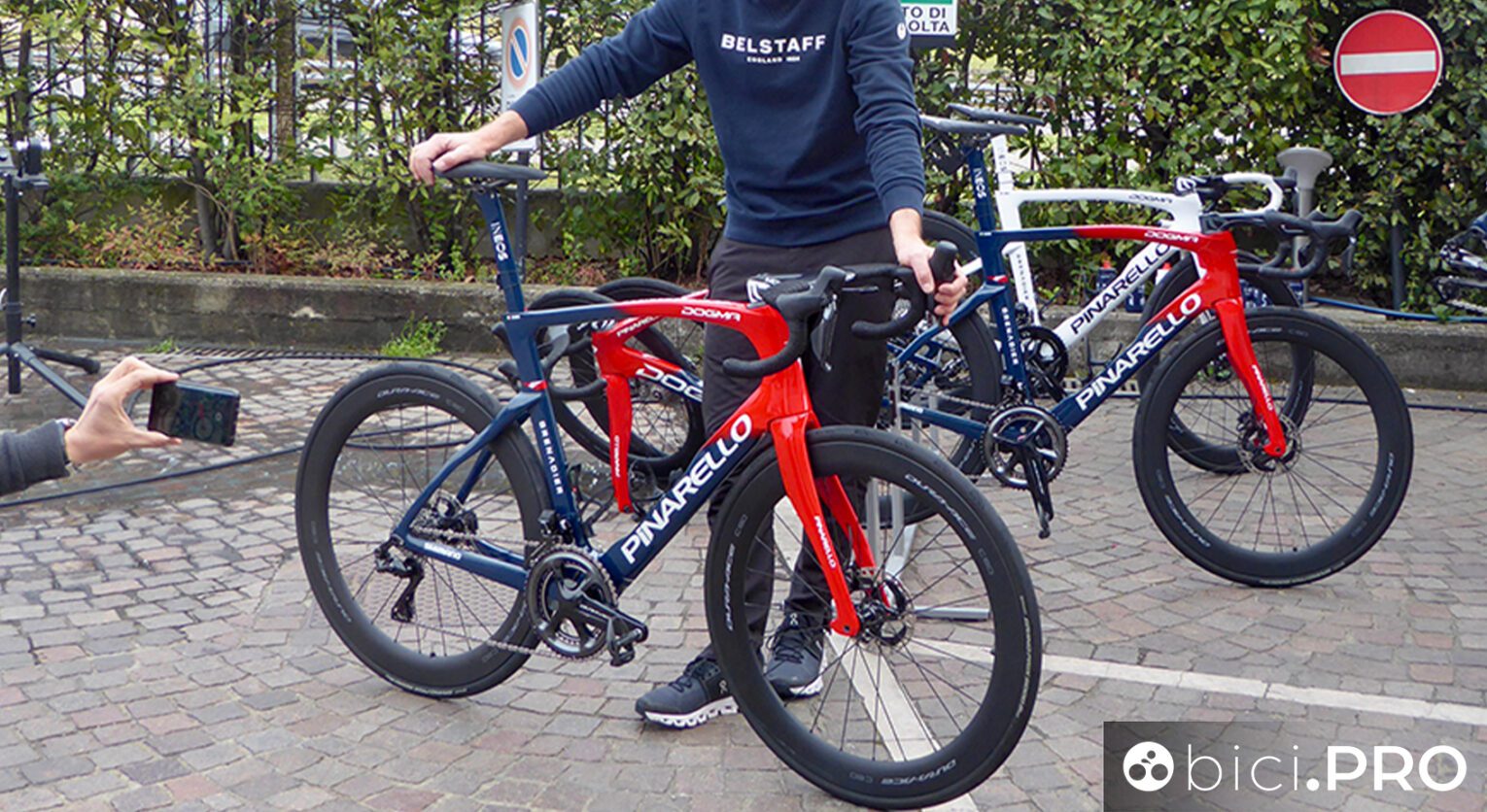 Tutti gli atleti sono partiti con pneumatici tubeless Continental e la sezione scelta è quella da 28. La variabile è legata alle pressioni di esercizio, che dipende principalmente dal peso del corridore e dalle preferenze soggettive. Tutti gli atleti Ineos usano i manettini in linea alla piega manubrio, non curvati all’interno. Tutte le Pinarello Dogma F Disc hanno un chain-catcher per evitare la caduta della catena tra le corone e la scatola del movimento centrale. A questo si aggiunge una sorta di spessore nella parte bassa del telaio, una sorta di salva fodero basso, lato catena. Tutti gli atleti utilizzano la medesima scala pignoni, ovvero 11-30.
