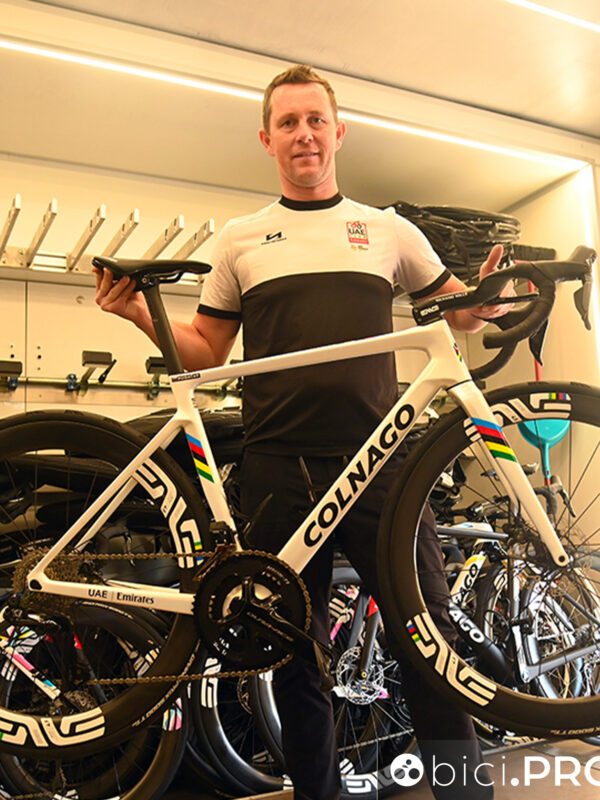 Sì, sempre queste, le Enve SES 4.5, anche in salita: esiste una versione normale e una leggera. Per lui è importante che la ruota sia veloce, non solo leggera. A inizio anno abbiamo parlato a lungo anche delle pressioni. In squadra c’è un addetto ai materiali, David Herrero, che stila l’elenco delle pressioni in base al peso dei corridori e alle condizioni della strada, asfalto o condizioni meteo. Arriva sempre quando ci sono le crono, dove indica anche il casco più adatto, le ruote e le gomme. E’ il responsabile dei materiali.