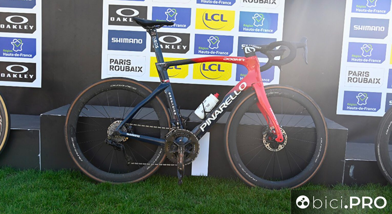 Una Dogma F per il vincitore, con pneumatici tubeless, manubrio full carbon integrato (il Most di Pinarello) e una sella Fizik che ad oggi non compare sul catalogo. Ha il design della Vento Argo (quella short nose) ed ha i rails in lega d’alluminio, ma non è una Vento Argo. Prima della partenza le biciclette esterne, erano di Rowe, Turner e proprio Van Baarle, quella di Ganna era al centro del tetto dell’ammiraglia. Un segno questo che va ad identificare il capitano/capitani designati dal team.
