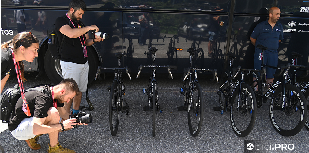 MORBEGNO – Il lavorìo dei meccanici attorno alle bici della Movistar ha richiamato l’attenzione di una troupe che sta girando immagini sulla vita quotidiana delle squadre al Giro d’Italia. Manca solo il controllo delle pressioni e poi le Canyon blu saranno pronte per la tappa.