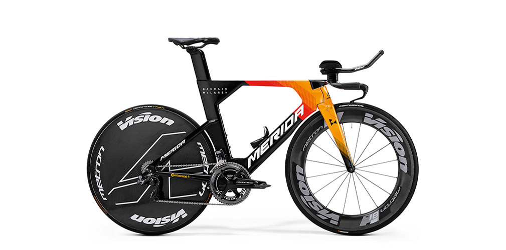 In occasione delle cronometro verrà utilizzata la Time Warp TT. L’ultima versione ha visto la luce alla fine del 2018 con una seri di miglioramenti notevoli rispetto alla precedente. La Ricerca e sviluppo di Merida è riuscita a migliorare l’aerodinamica con un incremento di 9 watt a parità di velocità. Inoltre, il peso è stato ridotto di 400 grammi, un bel vantaggio in caso di cronometro con un profilo ondulato. Il manubrio da cronometro è fornito sempre da Vision, così come le ruote, con la lenticolare Metron TFW al posteriore e la Metron 81SL all’anteriore.