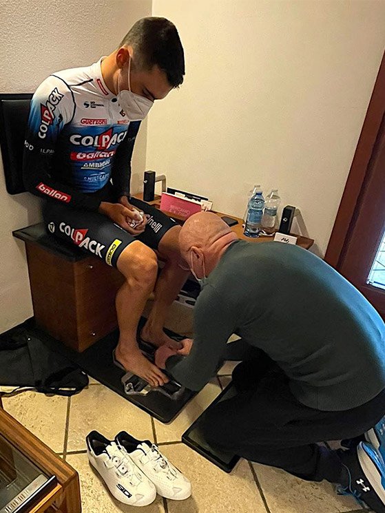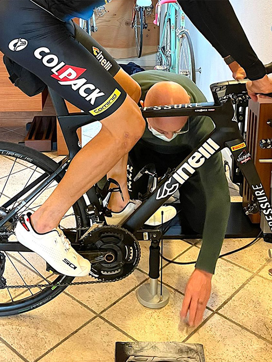 «La seconda “tappa” della mia visita passa poi per le scarpe. Analizzo bene la posizione del piede e della scarpa, come spinge quando pedala. Per me è importantissimo perché i piedi sono le fondamenta della posizione. Terza fase, passo alla sella: arretramento, inclinazione, altezza. Da lì sistemo poi anche la parte del manubrio, ma è una conseguenza».