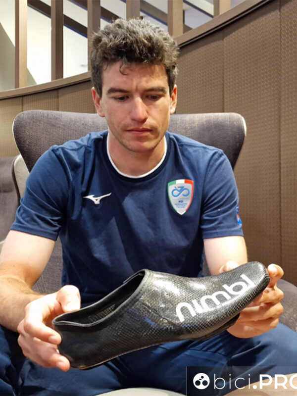 «La spinta sui pedali – conferma Affini – è eccellente, questo è dovuto al fatto che la suola è presa dal calco che Nimbl ha fatto direttamente sul mio piede. Di conseguenza prende la forma della pianta e segue la mia fisionomia. Non servono solette, a livello di sensazione è come se fossi direttamente sul pedale. Lo spessore è quello del foglio di carbonio usato nella realizzazione del modello».
