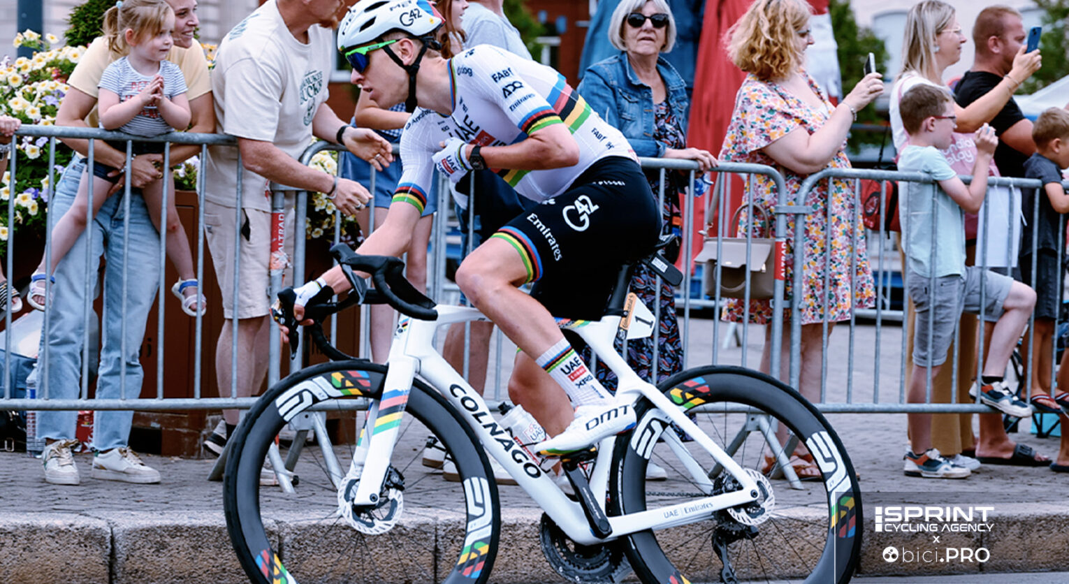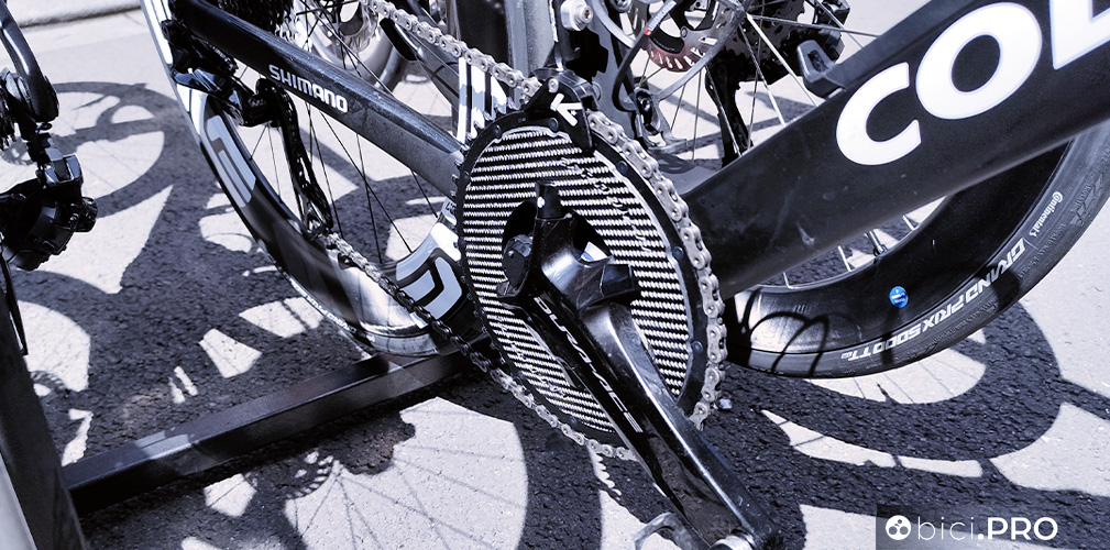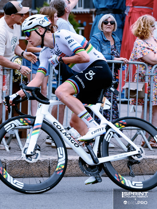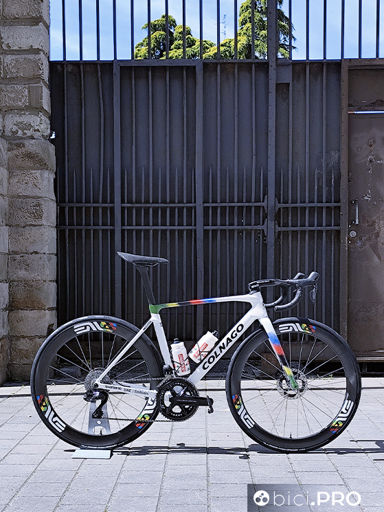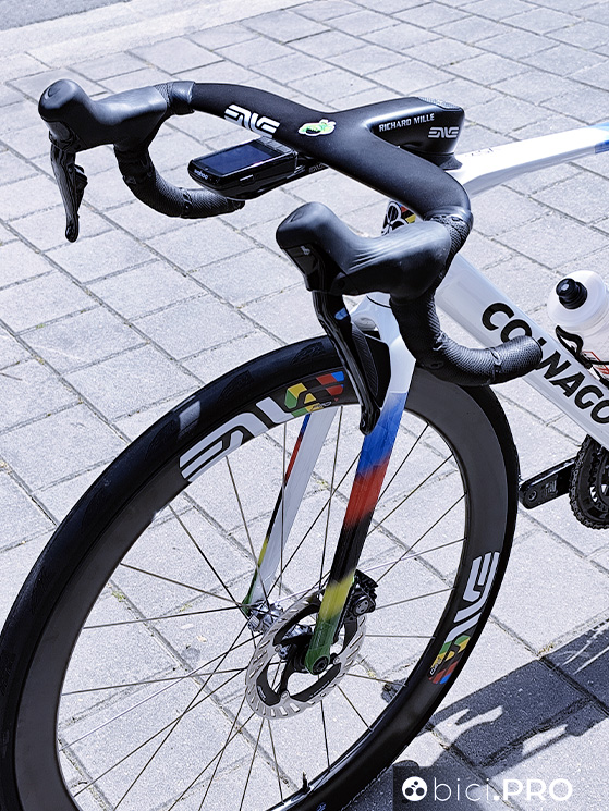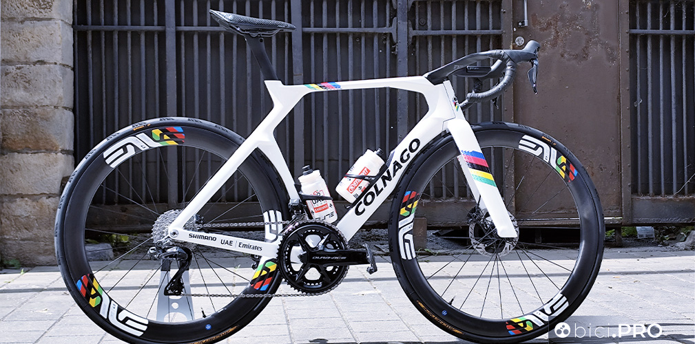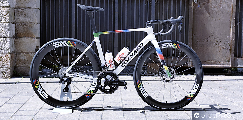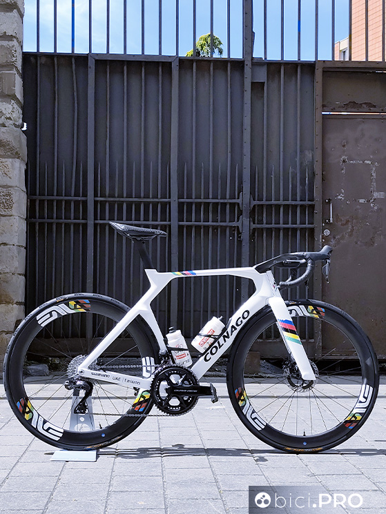 Partiamo dalla sua classica Colnago V5Rs, la bici che usa più spesso. Definirla “solita” è riduttivo. Anche per il Tour de France non ci sono state novità. I meccanici hanno preparato sia la versione con la guarnitura ufficiale Shimano, sia quella con le corone Carbon-Ti da 55-38 che Tadej utilizza praticamente sempre.