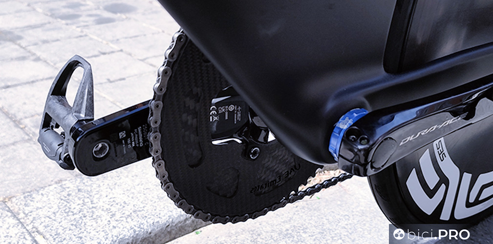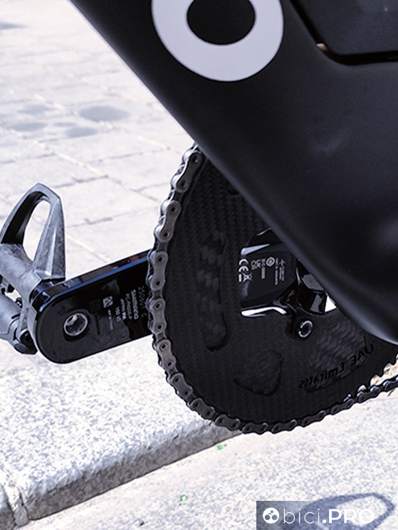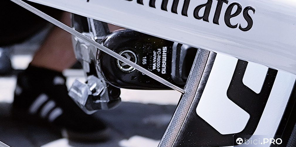 Se il peso è una peculiarità importante della TT1 di Pogacar, altrettanto importante è la misura delle pedivelle. Qui le 165 lasciano spazio alle 160 millimetri. Riguardo ai rapporti, la bici fotografata aveva una corona da 64 denti, ma questo varia in base al percorso, chiaramente.